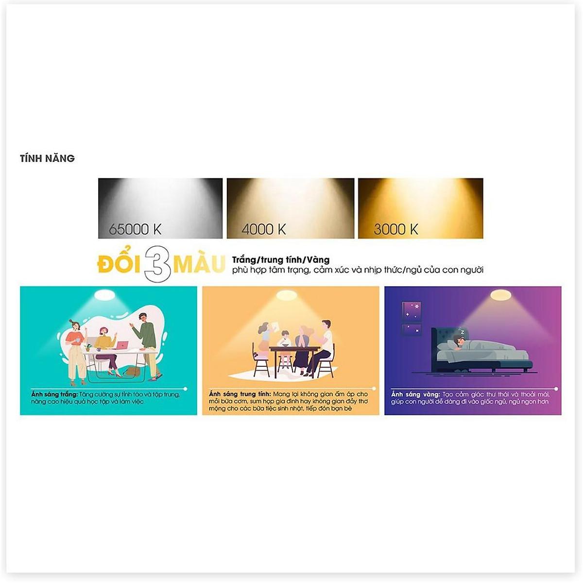 Công suất: 9W Điện áp: 220V/50Hz Đổi 3 màu: 4000K/5000K/6500K Quang thông: 580/680/600lm Kích thước (ØxH): (122x10)mm ĐK lỗ khoét trần: 110mm - Sử dụng chip LED Hàn Quốc chất lượng cao, tuổi thọ và