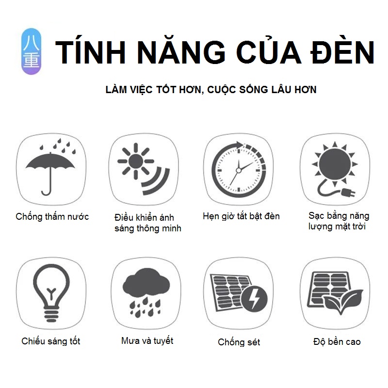 - Thân thiện môi trường: hoàn toàn được hỗ trợ bởi ánh nắng mặt trời, tấm pin và đèn LED năng lượng mặt trời làm giảm tiêu thụ nhiên liệu hóa thạch, loại bỏ ô nhiễm - Đèn năng lượng mặt trời sử dụng thuần pin năng lượng mặt trời cho mục đích chiếu sáng, được tự động hóa nên không mất tiền điện, tiền nhân công vận hành hàng tháng. Ưu điểm: - Đèn LED năng lượng mặt trời không phải đi dây cáp ngầm, tự động vận hành. - Tùy chỉnh tấm pin mặt trời theo từng vị trí để gom được tối đa năng lượng. - Độ sáng cao: đèn LED độ sáng lên đến 120lm /W. Độ sáng của đèn LED là tương đương với 2 ~ 3 lần so với của đèn HPS và 6~ 10 lần so với bóng đèn sợi đốt. - Được thiết kế để hoạt động trong những tháng mùa đông ngay cả khi có rất nhiều tuyết và mưa. - Tùy chọn góc mở và góc chiếu sáng cho các ứng dụng khác nhau. - Chế độ tiết kiệm năng lượng thông minh: điều chỉnh độ sáng cao cho giờ cao điểm, độ sáng mờ hoặc tắt về đêm muộn và tăng độ sáng vào lúc sáng sớm. - Dễ dàng cài đặt và lắp ráp và không tốn phí bảo trì. Ứng dụng: