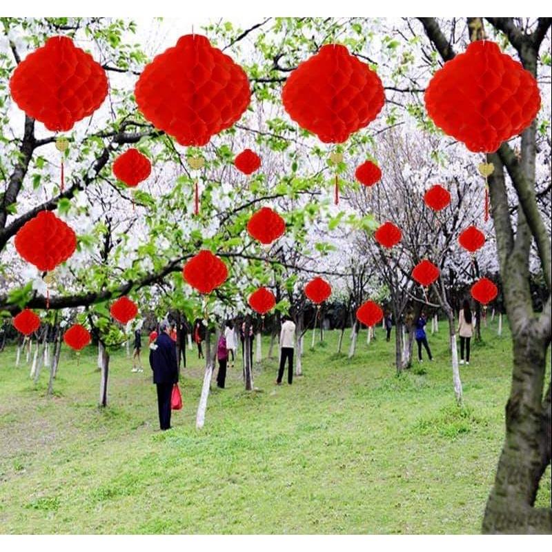 Sỉ COMBO 100 Đèn lồng tổ ong đỏ chất liệu nilong chống nước treo trang trí Tết siêu đẹp