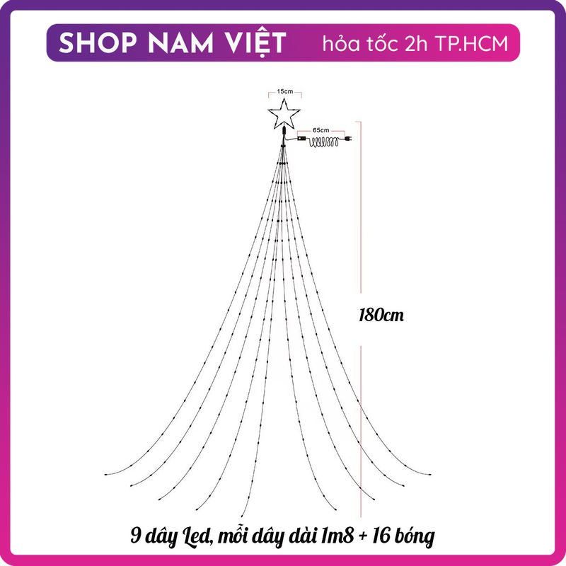 ️ Thông số Ngôi sao 15cm, 9 dây thả xuống, mỗi dây thả xuống dài 1m8 mét và có 16 bóng LED. Dùng nguồn điện 220V.