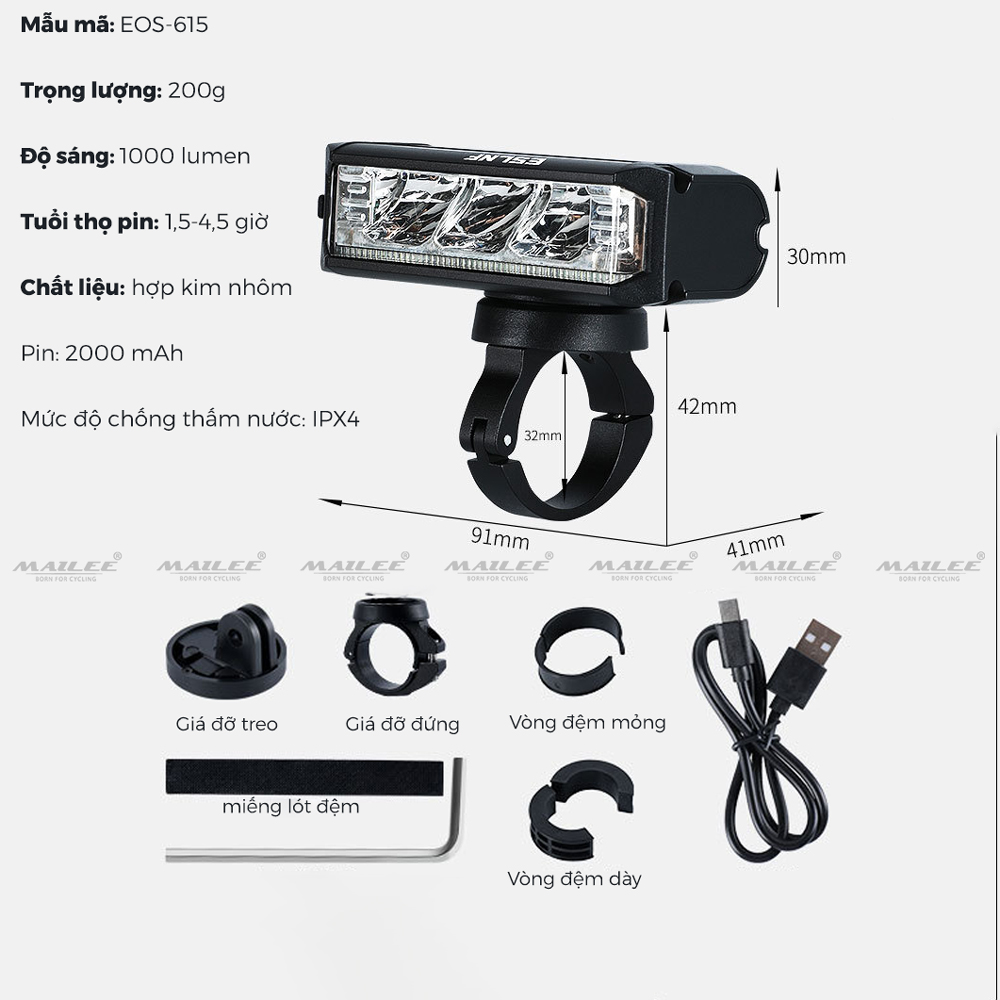 Pha Xe Đạp Mini 300 lumens EOS290 Sạc Điện USB Sáng Mạnh 3 Chế Độ Chống Nước Vỏ Hợp Kim Nhôm (pin 2000mAh) MaiLee Độ sáng phủ rộng lên đến
