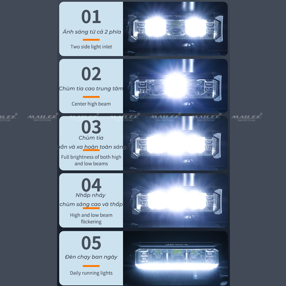 - Đèn với 4 chế độ sáng và 1 chế độ led ban ngày giúp tiết kiệm pin hiệu quả và đồng thời nâng cao an toàn khi đạp xe