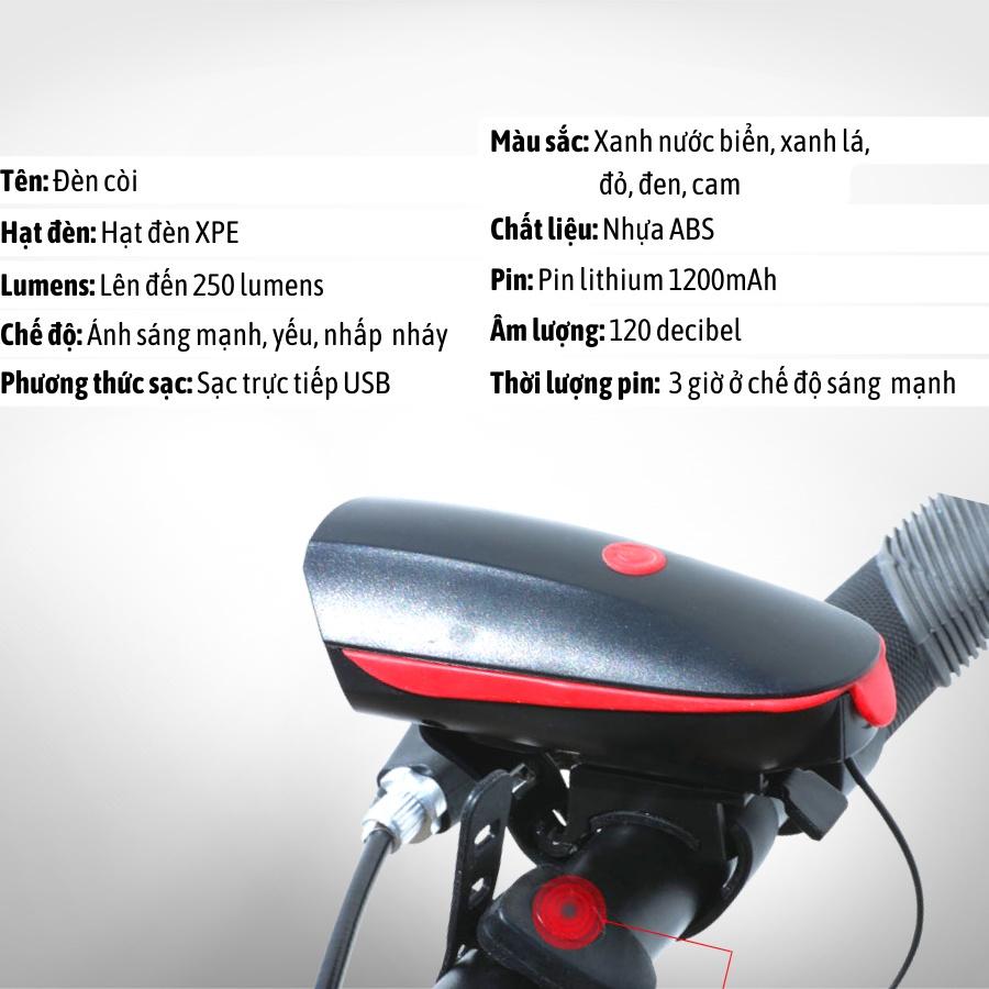 Đèn xe đạp thể thao siêu sáng có còi, đèn pin gắn xe đạp Thông sin sản phẩm và hướng dẫn sử dụng Đèn xe đạp có còi sạc usb chống nước: Thiết kế của đèn xe đạp kết hợp đèn hậu kết hợp đèn hậu thể thao được làm bằng nhựa cao cấp kết hợp cao su theo tiêu chuẩn chống nước ip44 đủ để hoạt động trong bất kỳ thời tiết như nắng nóng hay mưa rào **Đèn xe đạp thể thao có 2 nút bấm Sản phẩm đèn xe đạp Sử dụng pin liền sạc lại qua cổng usb dung lượng pin lên đến 1200mah theo công bố của nhà sản xuất pin có thể sạc trên 500 lần và khi sạc đầy (rơi vào khoảng 2 giờ) Tùy chế độ thời gian sử dụng sẽ khác nhau chế độ cường độ sáng (lumen) 1-Thời gian sáng mạnh 250LM 2.5H 2-Sáng mờ 125LM 5.0H 3-Nháy sáng 250LM 3.5H ÁNH SÁNG: đèn xe đạp kết hợp đèn hậu sử dụng bóng led công suất 3w hiệu suất cao với 3 chế độ sáng giúp người dùng di chuyển dễ dàng trong đêm tối CAM KẾT 100% Đèn xe đạp có còi sạc usb chống nước: Mẫu đèn này trên thị trường hiện tại có 3 loại và phụ kiện xe đạp dododios cam kết bán ra loại hàng cao cấp nhất tới tay khách hàng Phụ kiện xe đạp thể thao dododios cam kết sản phẩm Đèn xe đạp có còi sạc usb chống nước bán ra 100% được kiểm tra hoạt động bình thường trước khi gửi đi cho quý khách. Các bạn yên tâm nhận hàng bất cứ vấn đề phát sinh khi sử dụng sản phẩm đèn xe đạp này bạn vui lòng inbox giúp dododios. Khi nhận hàng quý khách vui lòng quay video mở hộp sản phẩm giúp dododios nếu sản phẩm bị lỗi dododios sẽ đổi hàng hoặc hoàn tiền lại cho quý khác CÁM ƠN SỰ TIN TƯỞNG TỪ CÁC BẠN. SHOP RẤT MONG NẾU CÁC BẠN HÀI LÒNG VỀ SẢN PHẨM VUI LÒNG CHO SHOP XIN 1 ĐÁNH GIÁ 5 SAO KÈM BÌNH LUẬN VÀ 5 HÌNH ẢNH ĐỂ dododios CÓ THÊM ĐỘNG LỰC PHỤC VỤ CÁC BẠN TỐT HƠN NỮA :)) =>Sản phẩm đèn xe đạp rất tiện lợi cho các bác đạp xe vào những lúc sáng sớm chắc chiều tối tránh được va chạm từ xe phía sau khi không nhìn thấy báo hiệu từ xe đạp của các bác. Đèn xe đạp thể thao này có dung lượng pin rất tốt nên các bác cứ yên tâm khi phải đạp đường dài từ 2-3 tiếng mà không lo hết pin đèn xe đạp các bác nhé !! 2600mAh có mạch bảo vệ (kèm theo) Chống nước: IPX6, chịu va đập: 1m Bảo hành 1 năm, 1 đổi 1 do lỗi nhà sản xuất Toàn bộ thông số của đèn được sản xuất theo Tiêu Chuẩn ANSI /PLATO FL1 do Tổ chức thương mại đèn pin chiếu sáng Hoa Kỳ ban hành.