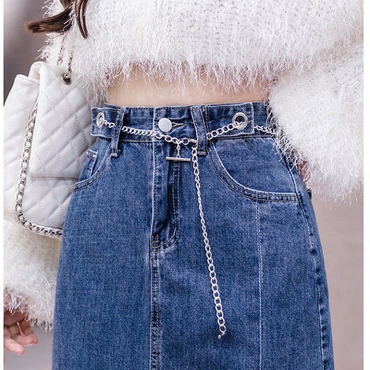 Phom dáng dài ngang giữa bắp chân với người cao tầm 1m65, xẻ 1 bên tà cách điệu độc đáo Chân váy jean có tặng kèm thắt lưng bằng kim loại mạ vàng ánh kim sang trọng, độc đáo