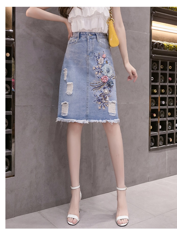 Mua tại Tiktok- Chân váy jean ngang gối đính hoa 09, Chân váy thiết kế cao cấp, vải jean dày C020
