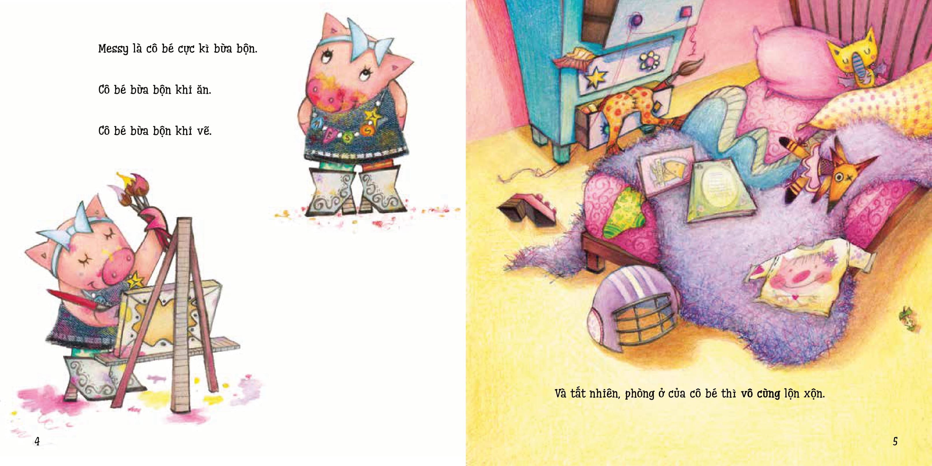 Cuốn “Dọn gọn gàng, ngăn nắp” kể về cô bạn lợn nhỏ Messy vô cùng bừa bộn, trong phòng đồ chơi quẳng khắp nơi, quần áo không chịu dọn… thế nên khi chiếc vòng cổ yêu thích bị thất lạc thì cô bé không biết tìm ở đâu. Liệu bạn Messy có tìm thấy chiếc vòng không nhỉ? Và liệu sau vụ này, bạn ấy có gọn gàng, ngăn nắp hơn không?