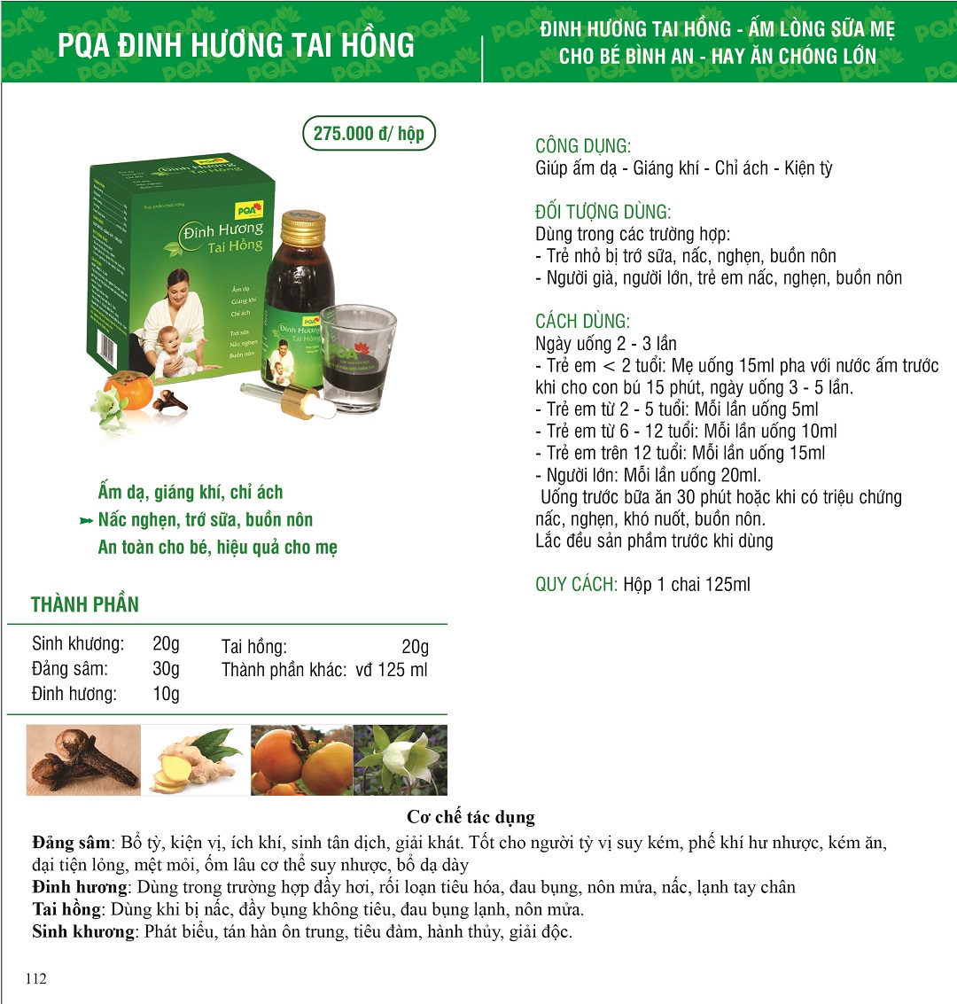 Đinh Hương Tai Hồng PQA Giúp Ấm Dạ, Giáng Khí Dùng Cho Trẻ Nhỏ Và Người Già Nôn Trớ, Nấc, Nghẹn, Buồn Nôn Chai 125ml. THÔNG TIN SẢN PHẨM: - Xuất xứ: Việt Nam -
