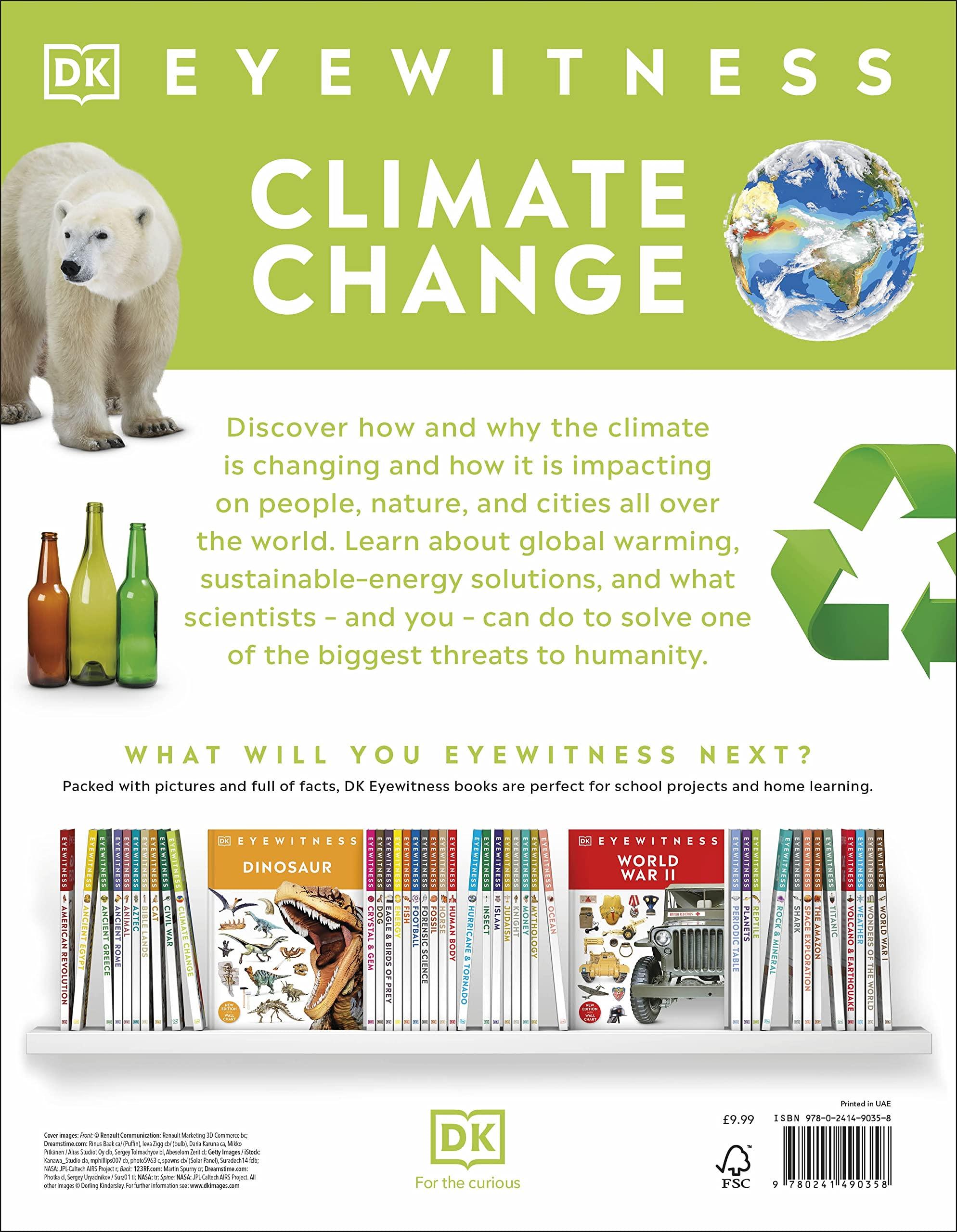 DK Eyewitness Climate Change explains why human activities are making the planet heat up. Learn all about the causes of climate change, such as fossil fuels and pollution. Explore the effects that global warming has on humans and animals across the world, from more frequent hurricanes and wildfires to melting ice caps and rising sea levels.