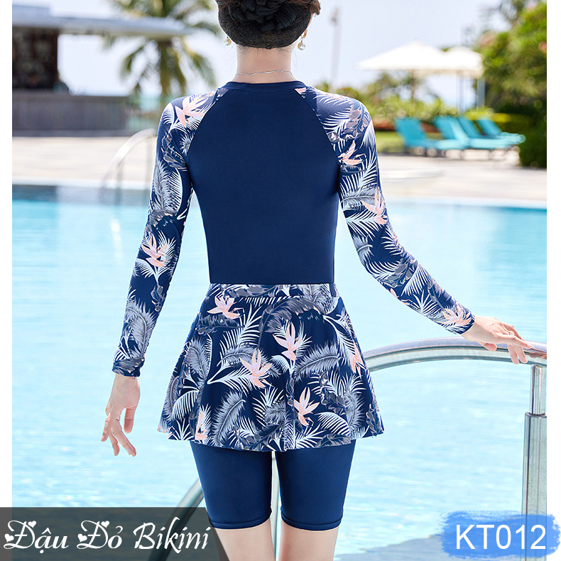 Bộ đồ bơi cho nữ dài tay hai mảnh, chân váy liền quần, size 40kg đến 70kg, áo sẵn đệm ngực | KT026