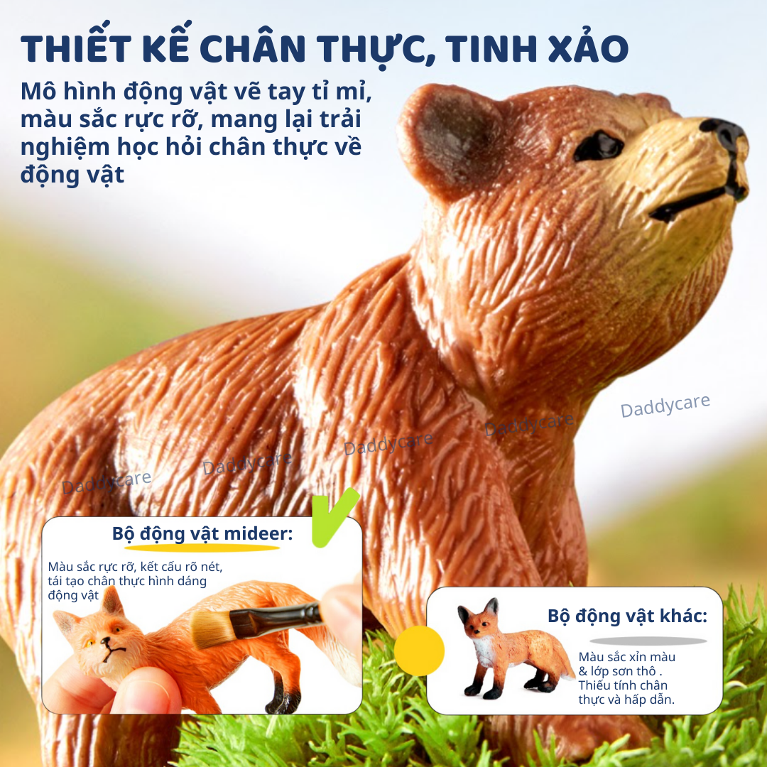 - Bộ động vật mideer: Màu sắc rực rỡ và kết cấu rõ nét, được thiết kế để tái tạo chân thực hình dáng thực sự của động vật
