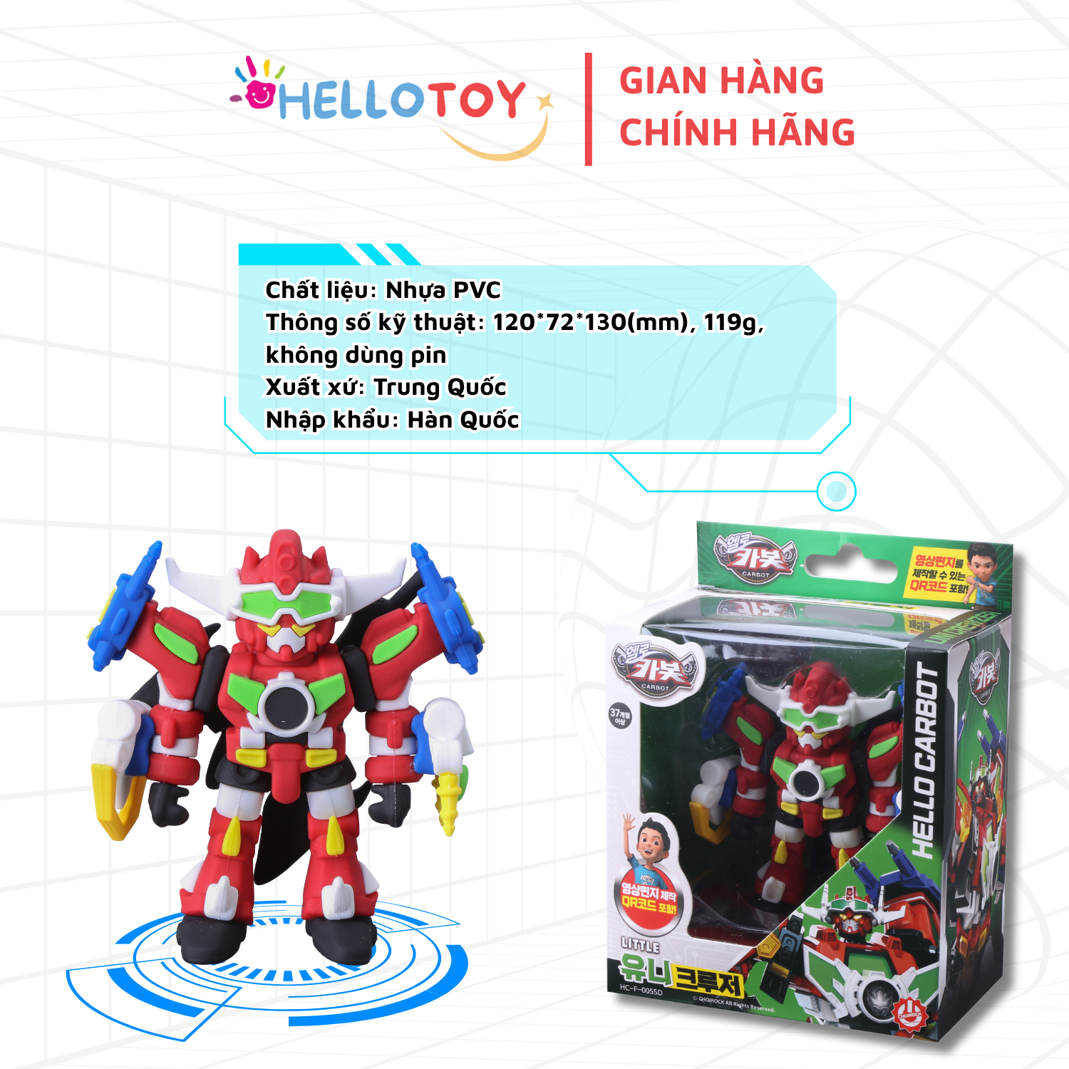 - Thông tin bổ sung:Hình ảnh và văn bản không cung cấp thông số kỹ thuật, chất liệu hoặc đặc điểm cụ thể nào khác của sản phẩm. Vui lòng liên hệ nhà sản xuất để biết thêm chi tiết. Lưu ý: Tất cả thông tin được cung cấp chỉ dựa trên dữ liệu sản phẩm đã cho, không có giả định hoặc mô tả chủ quan. 1.Tên sản phẩm: Đồ chơi trẻ em 2.Tên hàng hóa: [HELLO CARBOT] LITTLE ZETCREWZER 3.Mã hàng hóa: HC-F-006SD 4.Thành phần: Nhựa PVC 5.Thông số kỹ thuật: 12072130 (mm), 139g, không dùng pin 6.Tuổi sử dụng: Trên 37 tháng 7.Hướng dẫn sử dụng: chơi và trưng bày 8.Cảnh báo: Không thích hợp cho trẻ em dưới 37 tháng, có các chi tiết nhỏ!