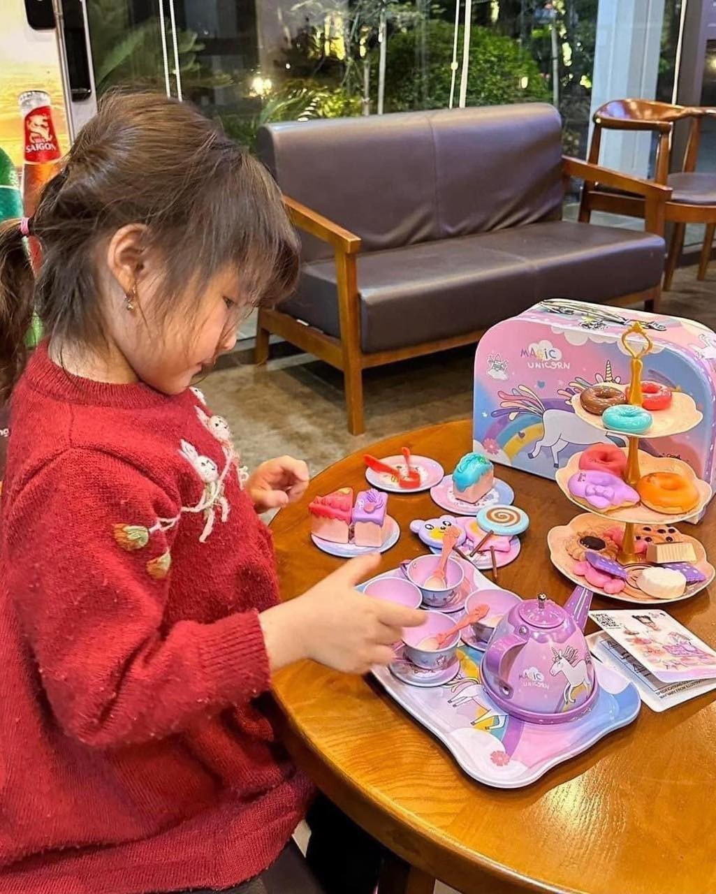 - Bộ đồ chơi tiệc trà bánh họa tiết đáng yêu có kiểu dáng thiết kế ngộ nghĩnh, đáng yêu, màu sắc bắt mắt.