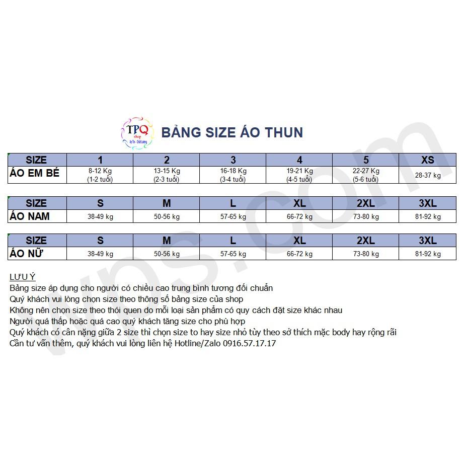 - Áo Size nam nữ như nhau: S dưới 48kg, M dưới 57kg, L dưới 67kg, XL dưới 77kg, XXL dưới 86kg .( em bé vui lòng ghi chú cân nặng và chiều cao) _ Hoặc bạn ghi chú cân nặng chiều cao khi đặt hàng Sản phẩm này là tài sản cá nhân được bán bởi Nhà Bán Hàng Cá Nhân và không thuộc đối tượng phải chịu thuế GTGT. Do đó hoá đơn VAT không được cung cấp trong trường hợp này.