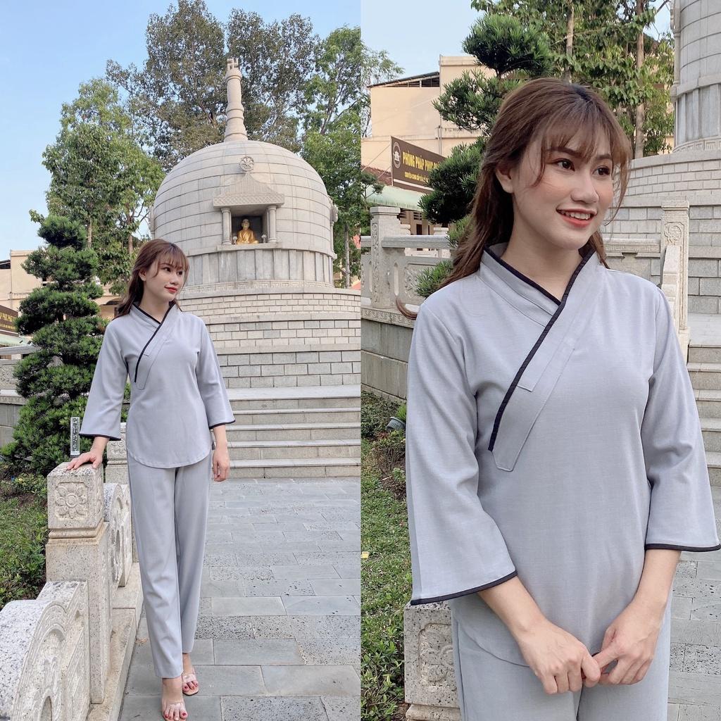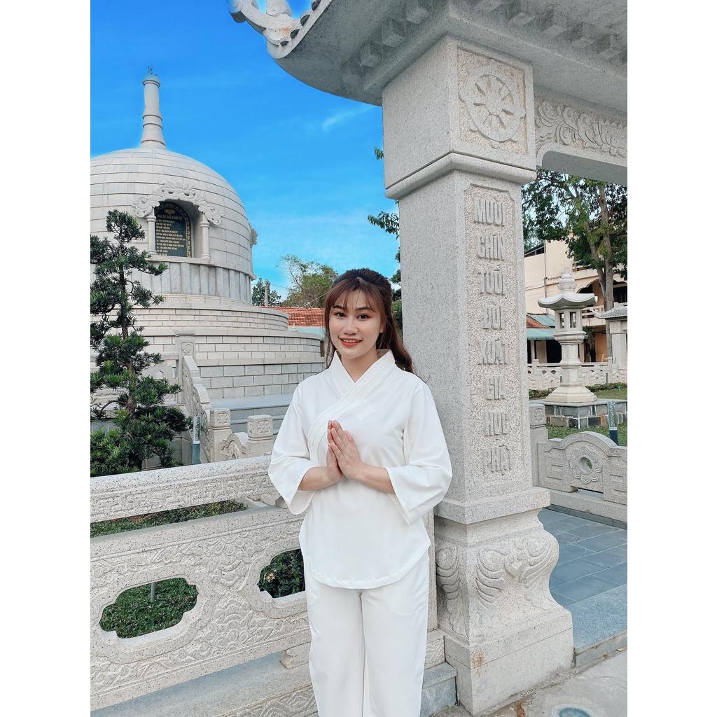 quần áo Phật tử cổ tàu cài chéo - đồ lam đi chùa Sen Hồng - set Phật tử nữ đẹp 0898553583