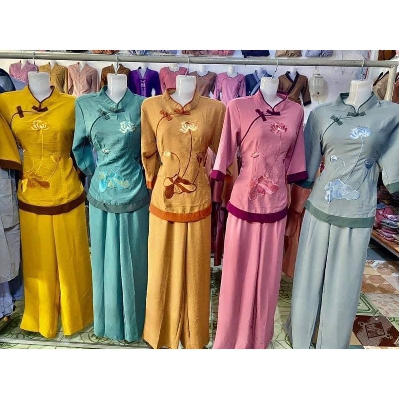 Quần áo phật tử, đồ lam đi chùa mẫu tơ phối thêu hoa