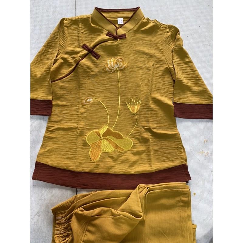 SIÊU PHẨM pháp phục nữ vải đũi lụa thêu sen cao cấp - quần áo lam đi lễ chùa chính hãng SEN HỒNG