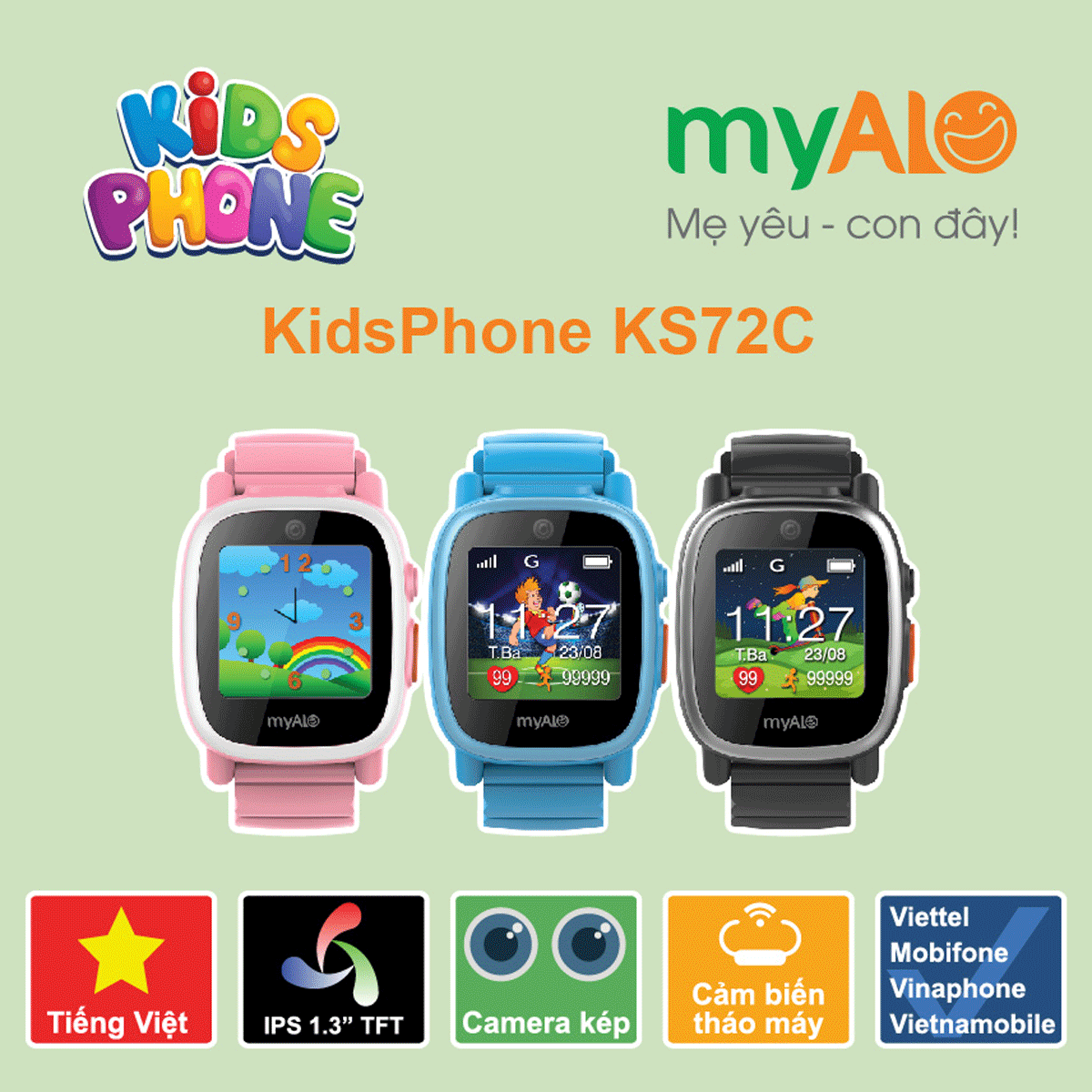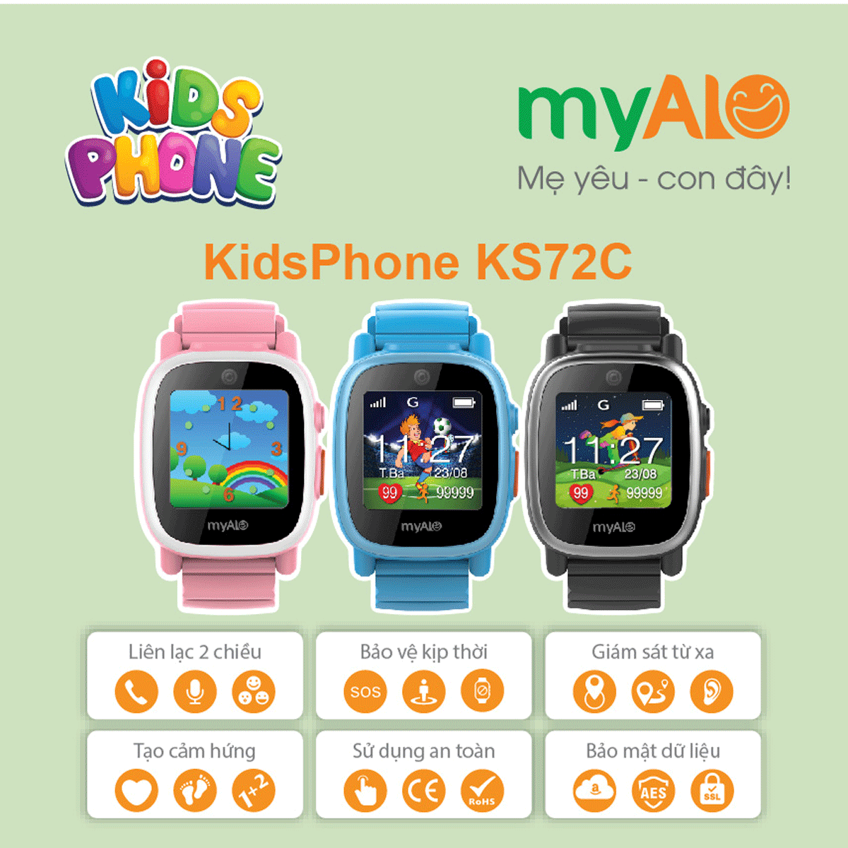- Sử dụng Ứng dụng miễn phí myAlo myKids hoàn toàn bằng tiếng Việt hỗ trợ iOS 7.0 và Android 4.4 trở lên Hãy dành cho trẻ KHÔNG GIAN TUYỆT VỜI NHẤT để phát triển, học tập và vui chơi với bạn bè! Điện thoại thông minh đeo tay myAlo KS72C là một thiết bị hoàn hảo kết hợp sức mạnh của điện thoại di động với chức năng của một chiếc đồng hồ định vị thông minh. Nó sẽ giúp bạn luôn cảm thấy yên tâm khi mang đến cho trẻ một không gian thoải mái và tuyệt vời nhất. LIÊN LẠC ĐƠN GIẢN & AN TOÀN Điện thoại myAlo Kisphone KS72C được thiết kế dành cho cả cha mẹ và trẻ: Thông qua danh bạ, trẻ có thể dễ dàng liên lạc 2 chiều với cha mẹ, gia đình và bạn bè bằng điện thoại và tin nhắn thoại. Gọi và nhận cuộc gọi dễ dàng