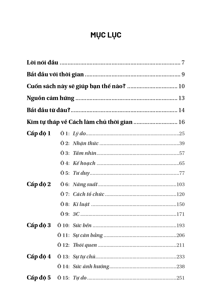 Trong đó, mỗi ô xây dựng kim tự tháp là một yếu tố bạn cần củng cố để xây dựng cho bản thân khả năng làm chủ thời gian của chính mình. Bằng cách khám phá mỗi ô kim tự tháp mà bạn sẽ cần chinh phục để đạt được sự tự do đích thực trong cuộc sống và công việc, tác giả sẽ giúp bạn làm quen với một mô hình đơn giản, thiết thực và dễ hành động theo, từ đó phát triển các thói quen về quản lý thời gian để thành công.