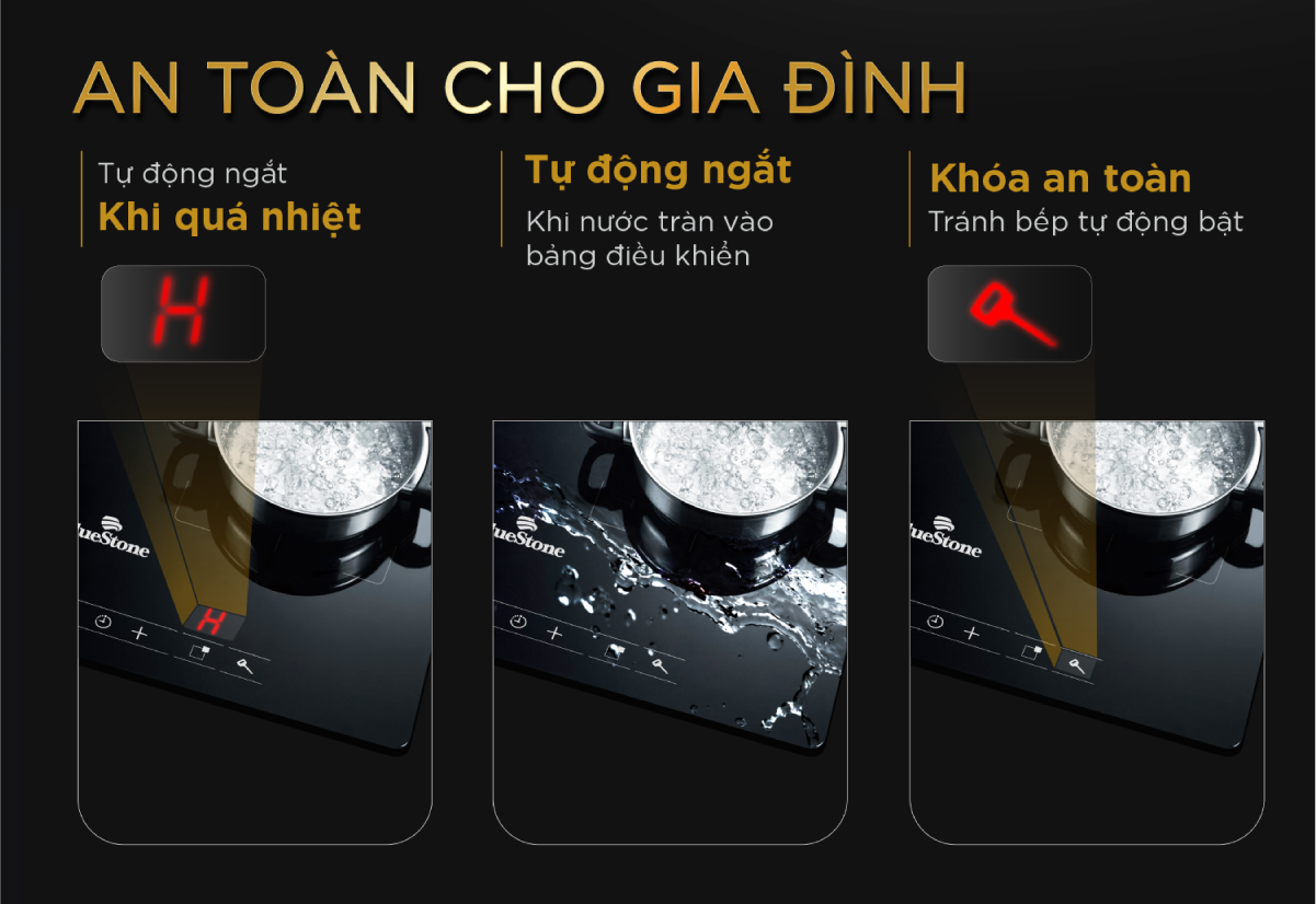 Tự động ngắt điện khi thức ăn cháy  Thực tế, khi đun thức ăn bị cháy dẫn đến mức nhiệt trên mặt kính vượt quá mức giới hạn nhiệt của bếp, hệ thống thông minh của bếp nhận diện mức này và ngắt điện.