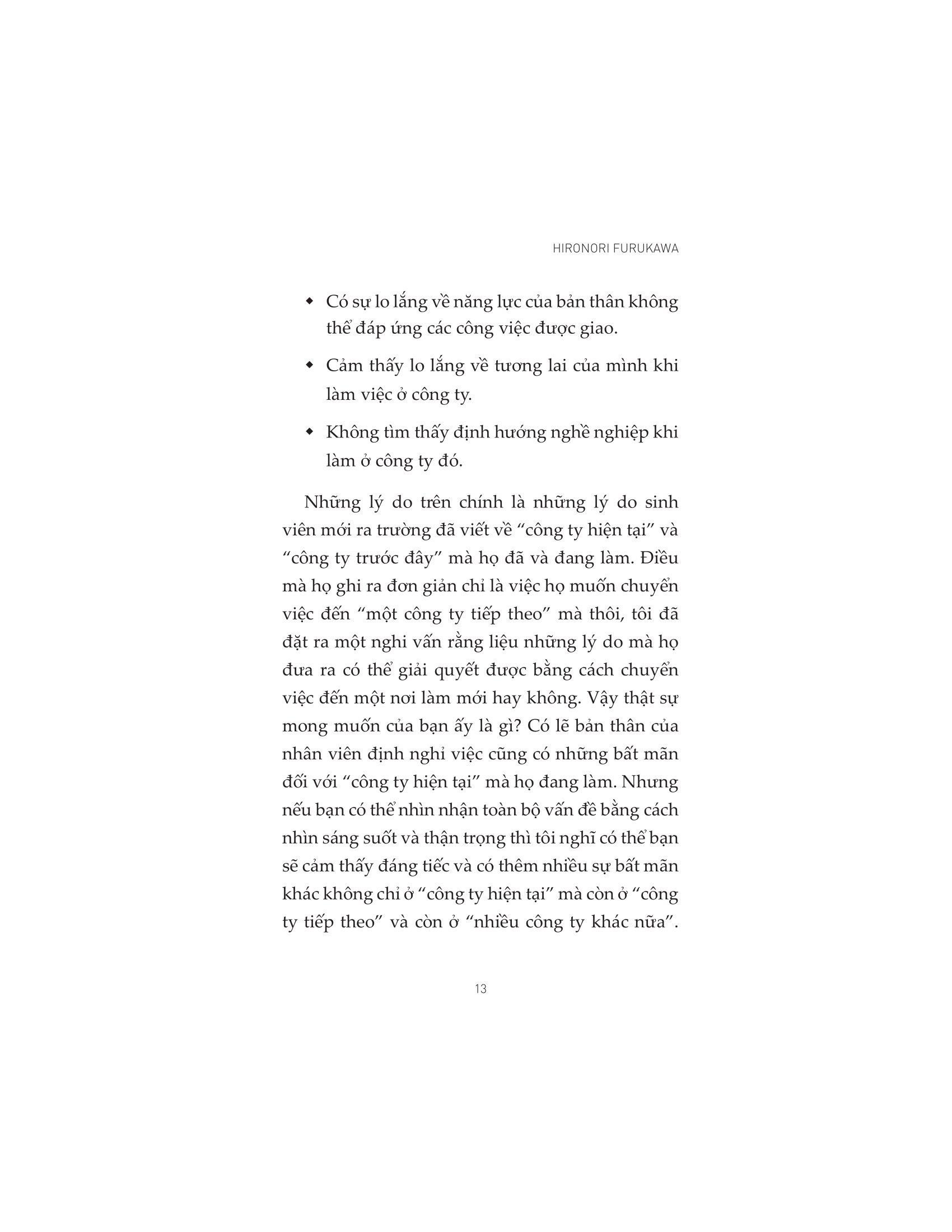 - Không tìm thấy định hướng nghề nghiệp khi làm ở công ty đó Bởi ở bất kỳ công ty nào cũng có các vị sếp “đáng sợ”, vậy nên việc rèn luyện kỹ năng giao tiếp nơi làm việc sẽ giúp các nhân viên trẻ mới đi làm không còn cảm thấy áp lực hay sợ hãi khi làm việc leader. Bên cạnh đó, tác giả cũng hướng dẫn các nhân viên cấp dưới các kỹ năng để nâng cao năng lực bản thân, chủ động trong công việc, tạo dựng được sự tín nhiệm và ủng hộ từ đồng nghiệp và xây dựng mối quan hệ làm việc hiệu quả với các cấp trên và tận hưởng công việc mỗi ngày của m.ình. “Đọc suy nghĩ – Thấu tâm trí” sẽ là tài liệu bổ ích giúp bạn đọc có cài nhìn nhiều chiều hơn về môi trường công sở để từ đó trang bị cho bản thân những kiến thức và kỹ năng cần thiết. Về tác giả: Hironori Furukawa sinh năm 1954 tại Ikeda, Osaka. Ông tốt nghiệp Khoa Thương mại tại Đại học Waseda. Quen thuộc với độc giả về các đề tài mối quan hệ cấp dưới – cấp trên và phát triển nguồn nhân lực, ông hoạt động như một người hướng dẫn đào tạo. Ông tập trung vào cải cách văn hóa doanh nghiệp, nâng cao nhận thức cho người làm kinh doanh và tạo động lực làm việc cho cấp dưới….