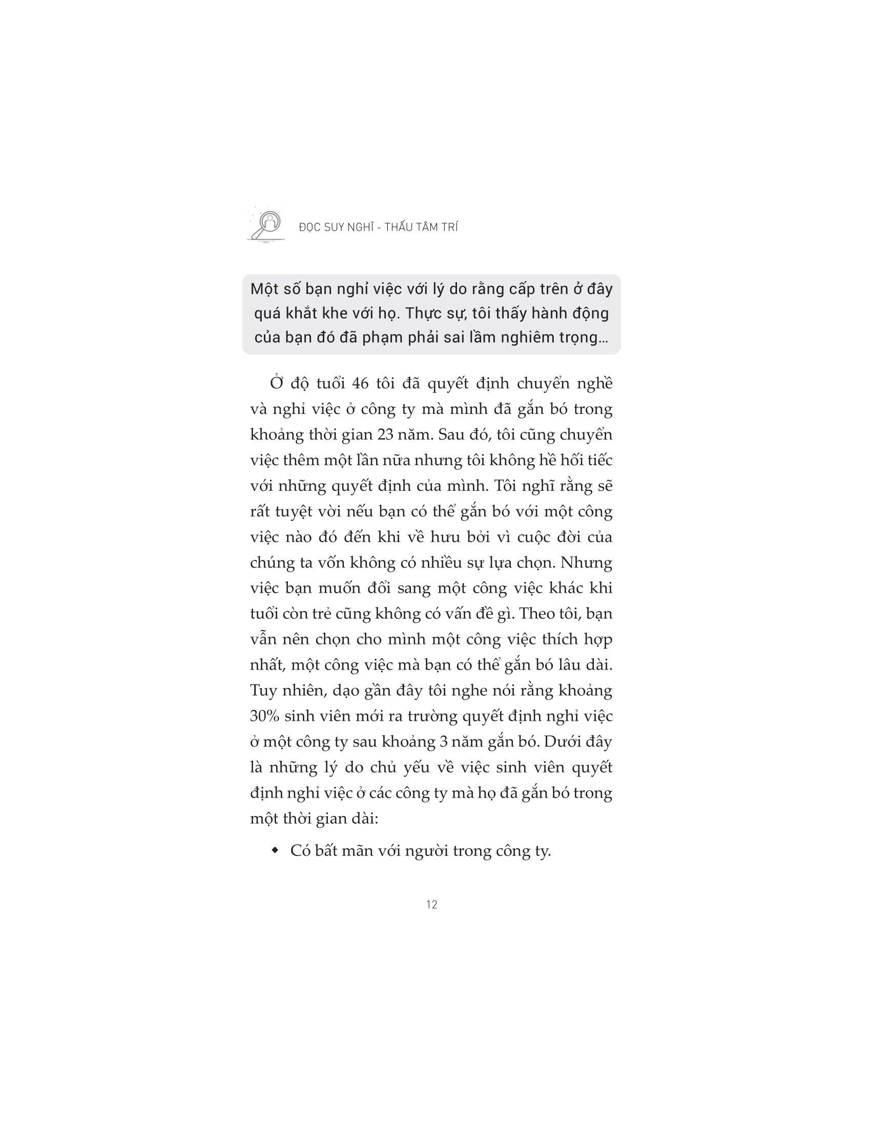Mua tại TiktokĐọc Suy Nghĩ - Thấu Tâm Trí Hầu hết nhân viên trẻ mới bước chân vào thị trường lao động đều sẽ đối mặt với những khó khăn nhất định trong việc hòa nhập vào môi trường làm việc và văn hóa công ty. Đối với những người làm đầu tiên đi làm, vấn đề lớn nhất có lẽ đến từ từ mối quan hệ với đồng nghiệp và các lãnh đạo trực tiếp cũng như gián tiếp. Khoảng 30% nhân viên trẻ và nhân viên mới rời công ty sau khoảng 3 năm gắn bó vì lý do giao tiếp công việc và áp lực từ cấp trên, nhưng không có gì đảm bảo rằng đến công ty mới họ sẽ không phải gặp lại vấn đề tương tự. Trong cuốn sách “Đọc suy nghĩ – Thấu tâm trí”, tác giả Hironori Furukawa trình bày một số nguyên nhân khiến nhân viên không thể gắn bó lâu dài với công ty: