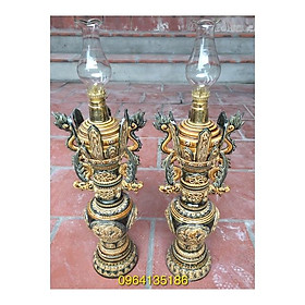 Đèn dầu men rạn chân đồng cao 42cm - Dáng đèn Trần Chất liệu: Gốm sứ men rạn bọc đồng Họa tiết: Rồng, Sơn Thủy, Bách Phúc Kích thước: cao 42cm, đường kính bụng ~12cm