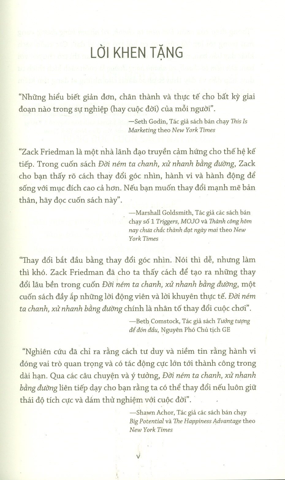Trước tiên, chúng ta hãy gặp những người sống Cuộc đời Xám nhạt, đó là Người hay viện cớ, Người luôn chấp nhận, và Người dám đổi mới. Họ là những người không thể bước qua Chiếc hố sâu mang tên Không thể và lựa chọn cho mình một cuộc đời ít niềm vui. Nhưng còn có người thứ tư, Người dám đổi mới, là người đã chọn sống đời rực rỡ, chọn pha nước chanh ngọt mát từ quả chanh chua mà cuộc đời ném cho mình.