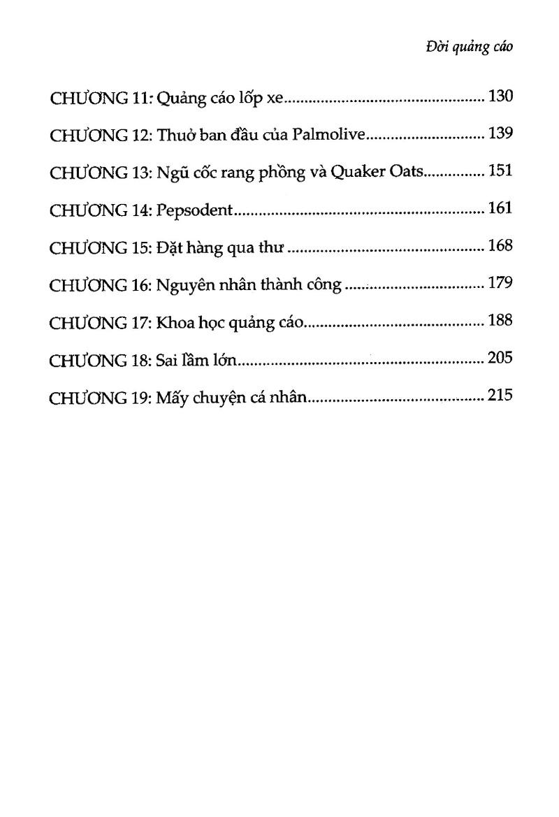 Quyển sách viết về những chiến dịch quảng cáo thực tiễn mà tác giả đã thực hiện cho các thương hiệu nổi tiếng như Palmolive, Pepsodent, Schlitz,… Đây là trải nghiệm thực tế nên không hề hàn lâm.