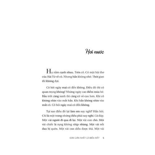 "Đơn giản nhất là biến mất" là tập truyện ngắn chủ yếu xoay quanh K, nhân vật xuất hiện ở nhiều nơi, trong nhiều câu chuyện, đôi khi như một nhân chứng, đôi khi chỉ là một bóng dáng. Không có gì rõ ràng về K, cũng không có gì thực sự cố định trong những mẩu chuyện này, chúng có thể là những giấc mơ, những ký ức, hoặc những cuộc hội thoại dang dở. Thành phố, căn phòng, bến tàu trong tập truyện có thể là bối cảnh cho một cuộc chia ly hoặc một cuộc gặp. Ở đó, có những người đã rời đi từ rất lâu, những lời hứa không ai nhắc lại. K không nói nhiều, hoặc có thể K đã từng nói, nhưng chẳng ai nhớ nổi.