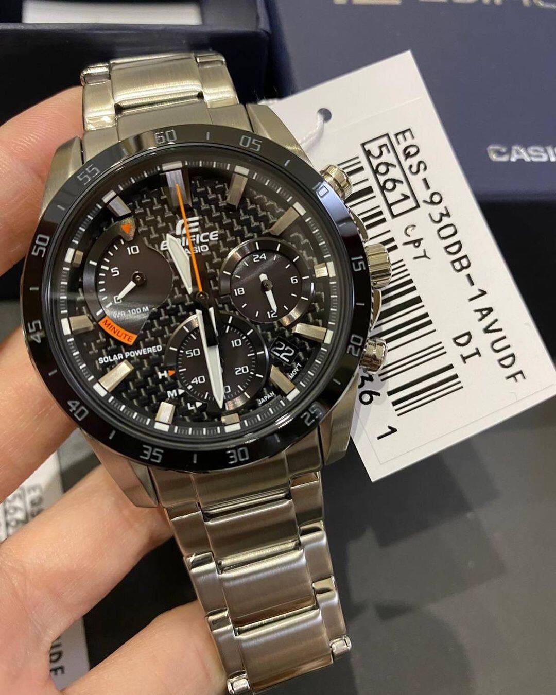 Đồng hồ ghi thời gian chạy bằng năng lượng mặt trời mới này có mặt số sợi carbon tượng trưng cho chủ đề đua xe thể thao của dòng sản phẩm EDIFICE. Màu sắc dễ nhìn của kim giây là kết quả của phản hồi từ các kỹ sư đua xe.