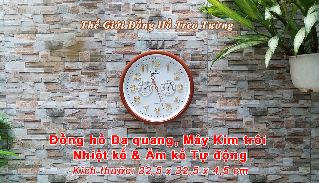 • Đồng hồ Kim trôi số nổi 3D có Dạ Quang và Nhiệt ẩm kế Cơ hình tròn kiểu dáng hiện đại, Viền kiểu Vân Gỗ với đường kính lên tới 32,5 cm, dày 4,5 cm.