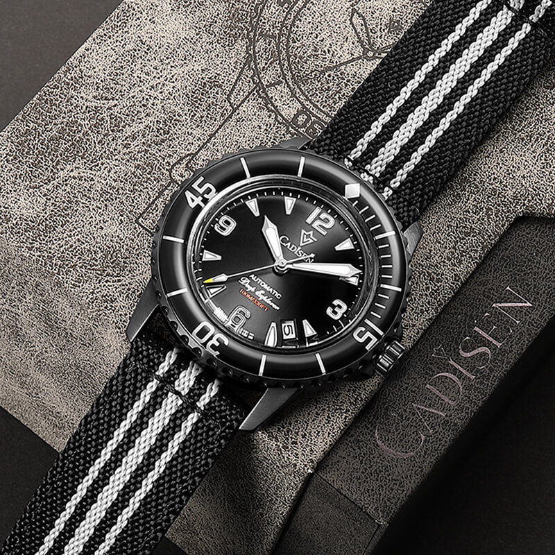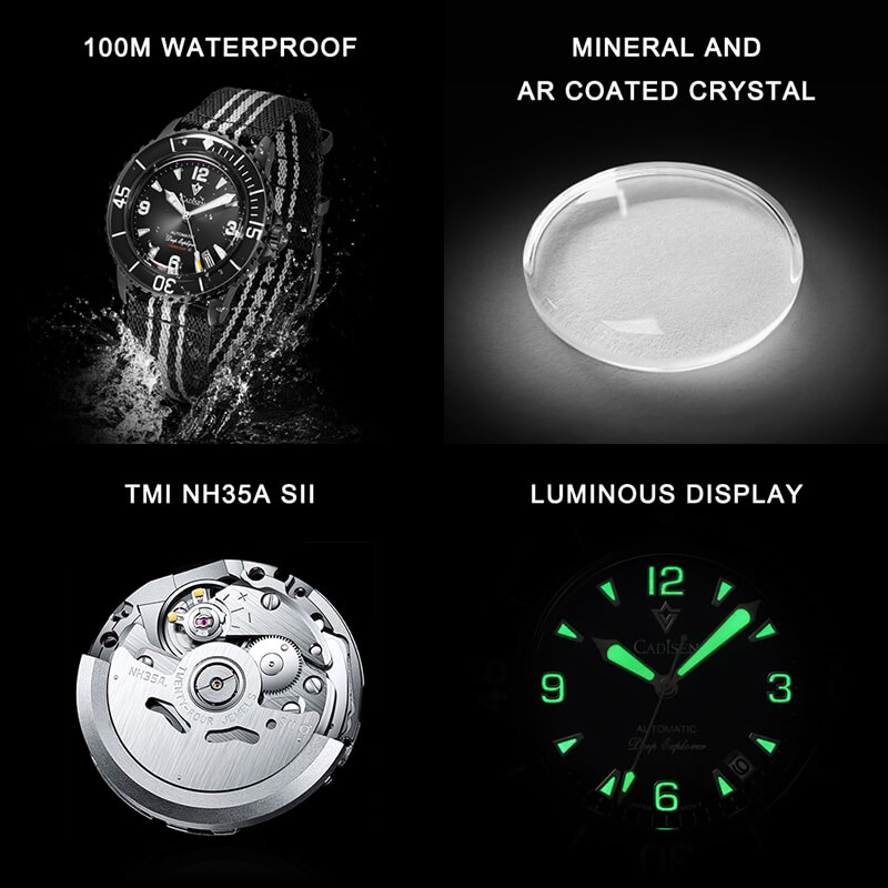 Thương Hiệu CADISEN Quốc gia đăng ký thương hiệu Nhật Bản Kiểu máy Nhật Bản (Japan Movt) Mã sản phẩm C8239M1 Giới tính Nam Loại sản phẩm Đồng hồ cơ (Automatic) Đường kính mặt 42 mm Chiều dày 12.5 mm Chất liệu vỏ Thép không gỉ 316L Chất liệu dây Dây dù cao cấp Chất liệu mặt kính Sapphire Độ chịu nước 10 ATM Bảo hành 24 tháng