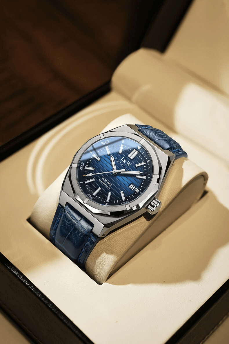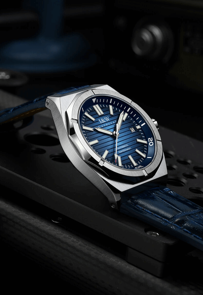 Phong cách cổ điển ở đây chính là Vân nổi Guilloche , kim InDex quyến rũ . Cùng mặt số xanh dương lạ mắt với vạch chỉ giờ dạ quang, tạo sự nam tính và phong cách đầy tính thời trang cho anh em.