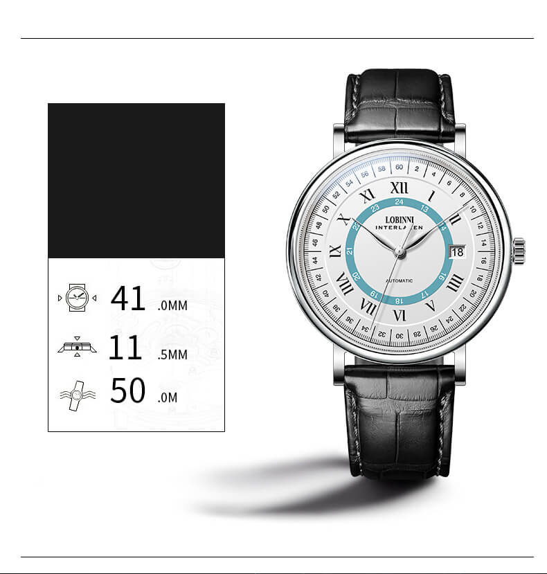Đồng hồ nam chính hãng LOBINNI Thụy Sỹ Thiết kế sang trọng, đẳng cấp cho quý ông Thời gian trữ cót lâu lên đến 40h Chống nước 5ATM, Kính sapphire Toàn bộ máy được làm