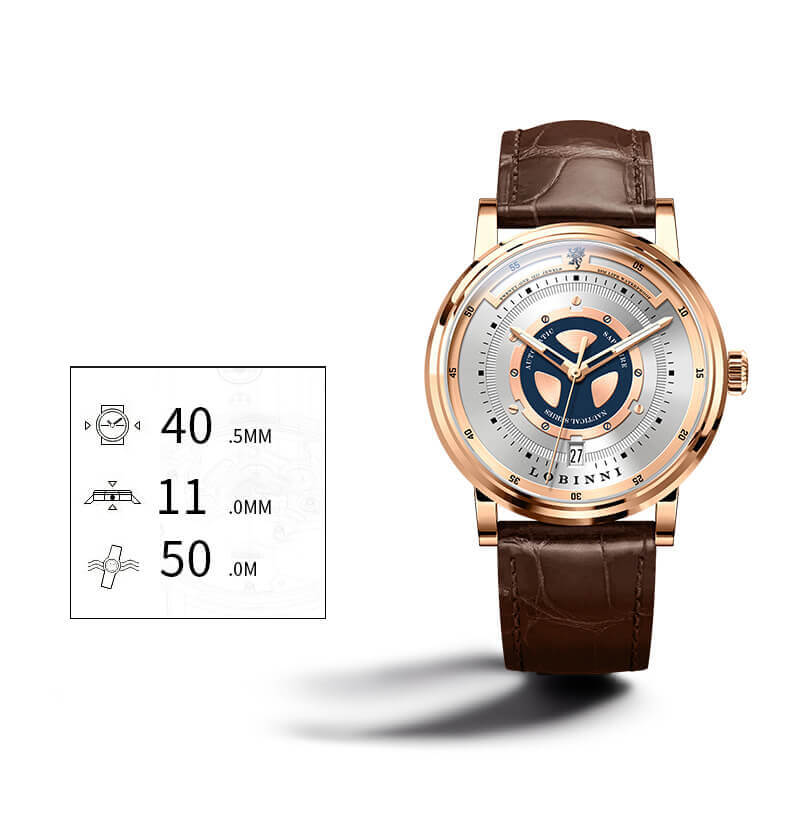Nhãn hiệu LOBINNI Mã sản phẩm No.16053-9 Giới tính Nam Kiểu máy Automatic (Máy Cơ) Đường kính mặt 43 mm Độ dày 11,5 mm Chất liệu vỏ Thép không gỉ 316L Chất liệu dây Dây da cao cấp Chất liệu mặt kính Sapphire Crystal