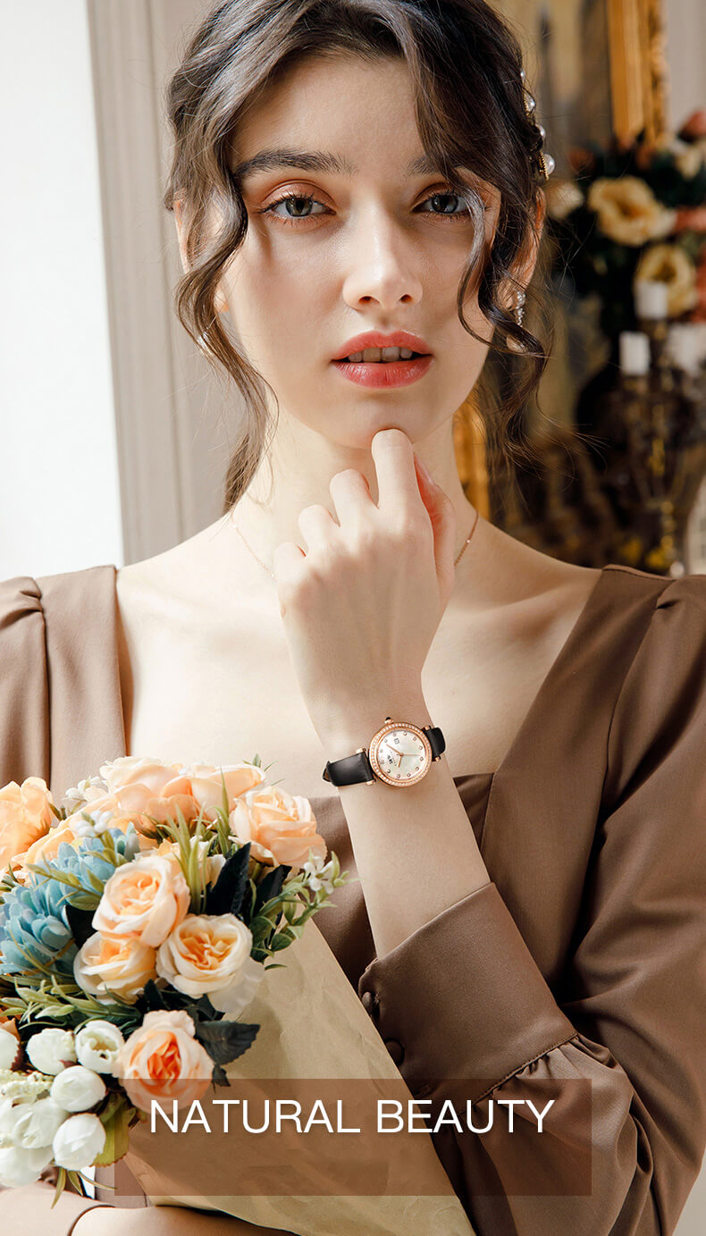 Chiếc đồng hồ thích hợp với các bạn nữ yêu thích sự trẻ trung, quyến rũ và với thiết kế nhỏ nhắn nhẹ nhàng cho nữ giới dây da tối màu giúp bạn dễ phối