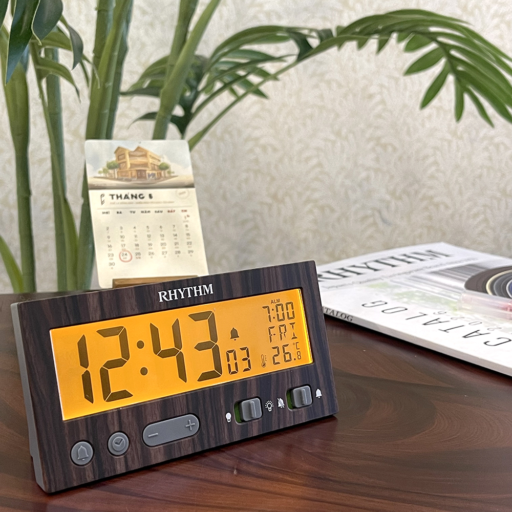 Mua tại TiktokĐồng hồ để bàn báo thức Rhythm LCT108NR06 – Kích thước 13.1 x 6.6 x 3.6cm, trọng lượng 150g. Vỏ nhựa vân gỗ. Dùng 2 Pin tiểu ( AA x 2). Màn hình tinh thể lỏng LCD tự động bật sáng trong tối ( màu cam nhạt – Auto Light On In The Dark). Hiển thị ngày, thứ, tháng bằng 8 thứ tiếng ( Anh , Đức, Pháp, Italy, Tây Ban Nha, Đan Mạch, Nga, ), Nhiệt độ , độ ẩm môi trường. Báo thức 4 cấp độ âm lượng tăng dần. Báo thức lập lại ( Snooze) chống ngủ nướng. Có đèn Led xem giờ trong tối bằng cảm ứng chạm mặt kính đồng hồ. ( Touch Sensor )
