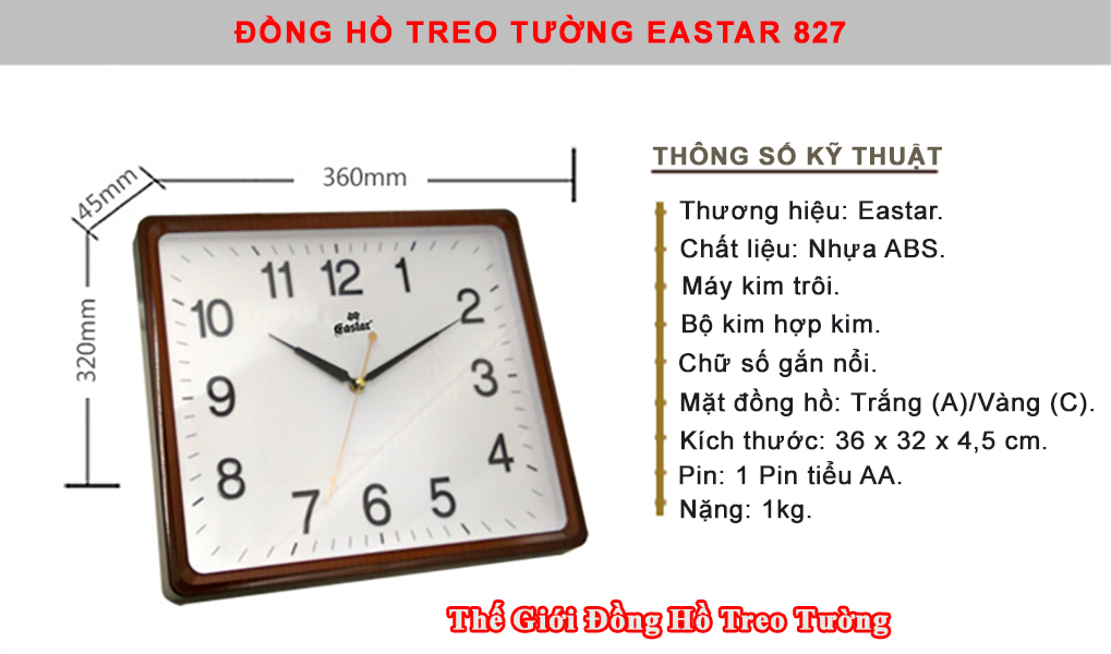 1. THÔNG TIN CHI TIẾT: - Thương hiệu: Eastar. - Loại: Máy Đồng hồ Treo tường Kim dạ quang Công nghệ Thạch anh (Quartz) chạy kim (Analogue), Loại máy đồng hồ kim trôi chạy êm