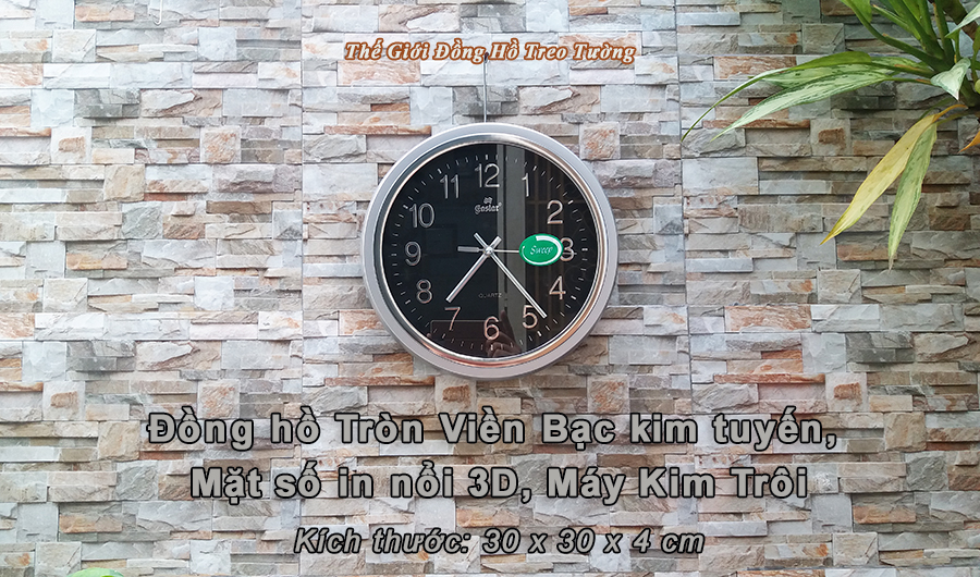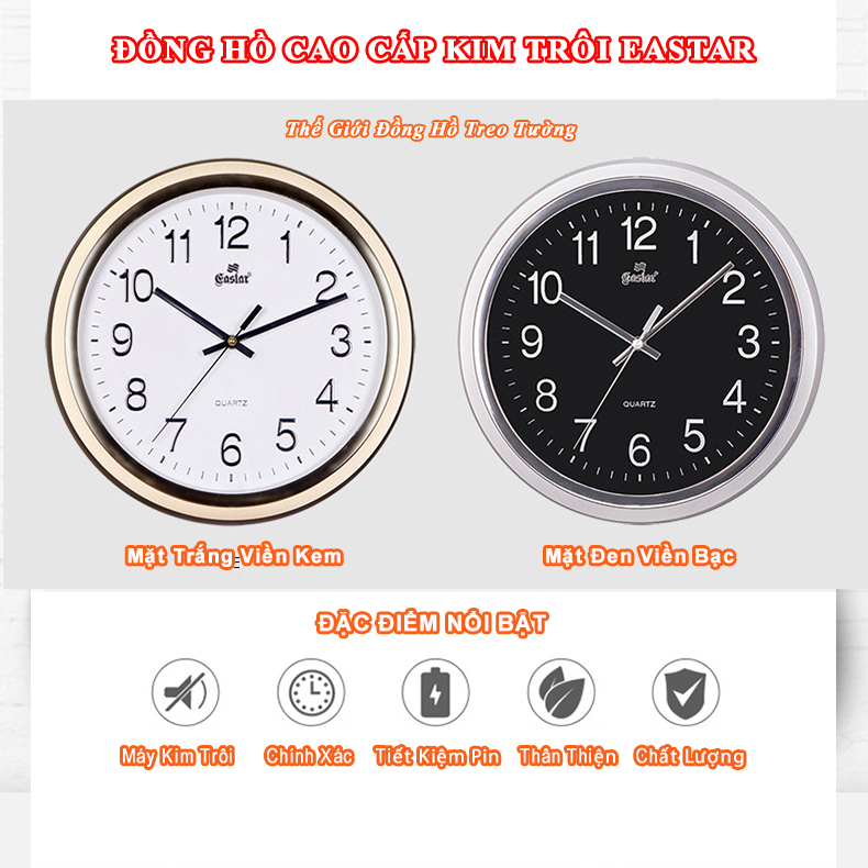 ✨Đồng Hồ Treo Tường KIM TRÔI EASTAR Cao Cấp Mặt Tròn Viền Bạc Kim Tuyến - Mặt số in Nổi 3D - Máy Kim trôi – Kèm Pin Maxell
