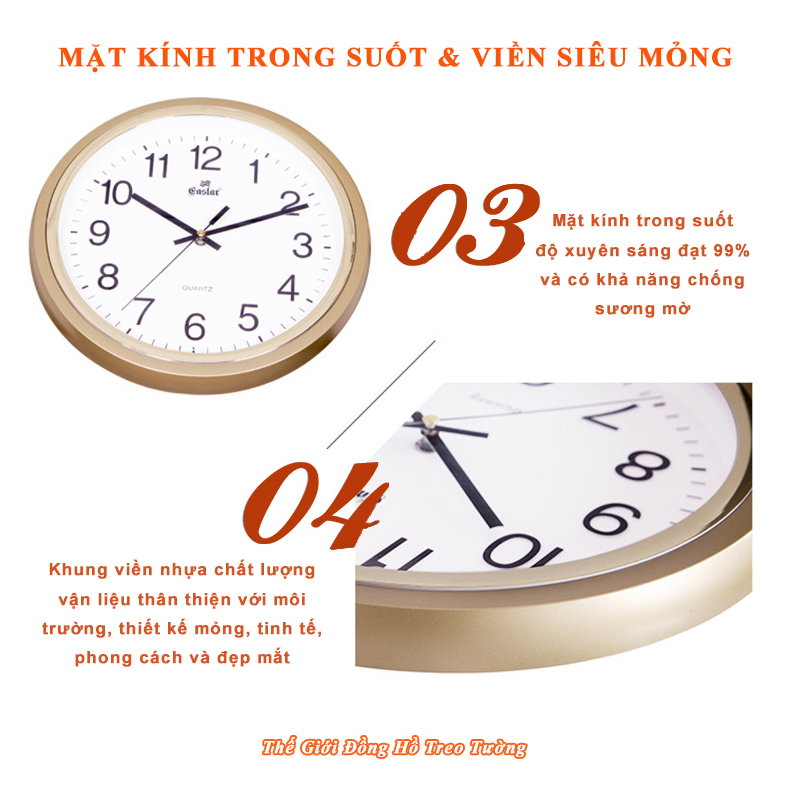 1. ĐẶC ĐIỂM NỔI BẬT: - Đồng hồ Treo tường Cao Cấp EASTAR có Dạ quang (*), máy đồng hồ Kim trôi mặt tròn Thương hiệu Gastar, đường kính 34 cm, dày 4,5 cm. -