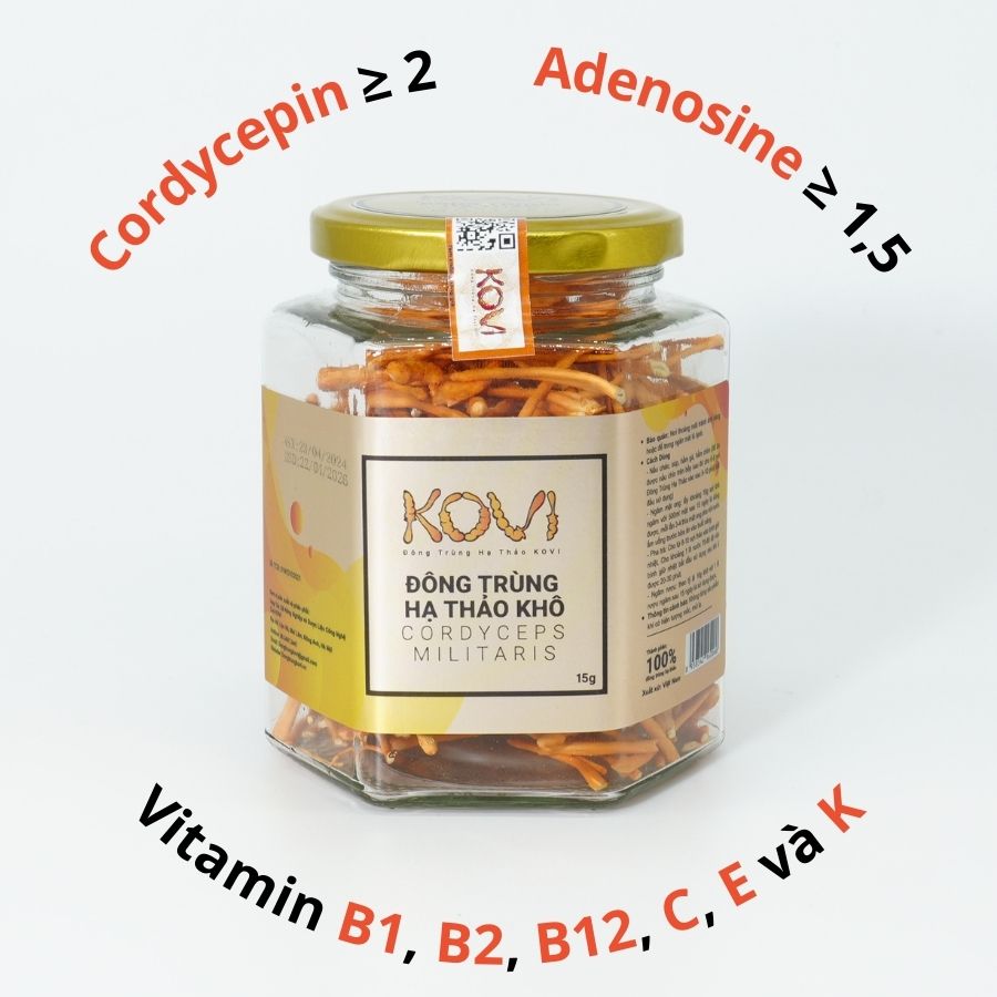 Đông trùng hạ thảo khô KOVI 50g là sản phẩm sấy thăng hoa giúp giữ nguyên vẹn các dưỡng chất quý giá như Cordycepin, Adenosine, Axit amin, Vitamin B1, B2, B12, C, E,... , mang