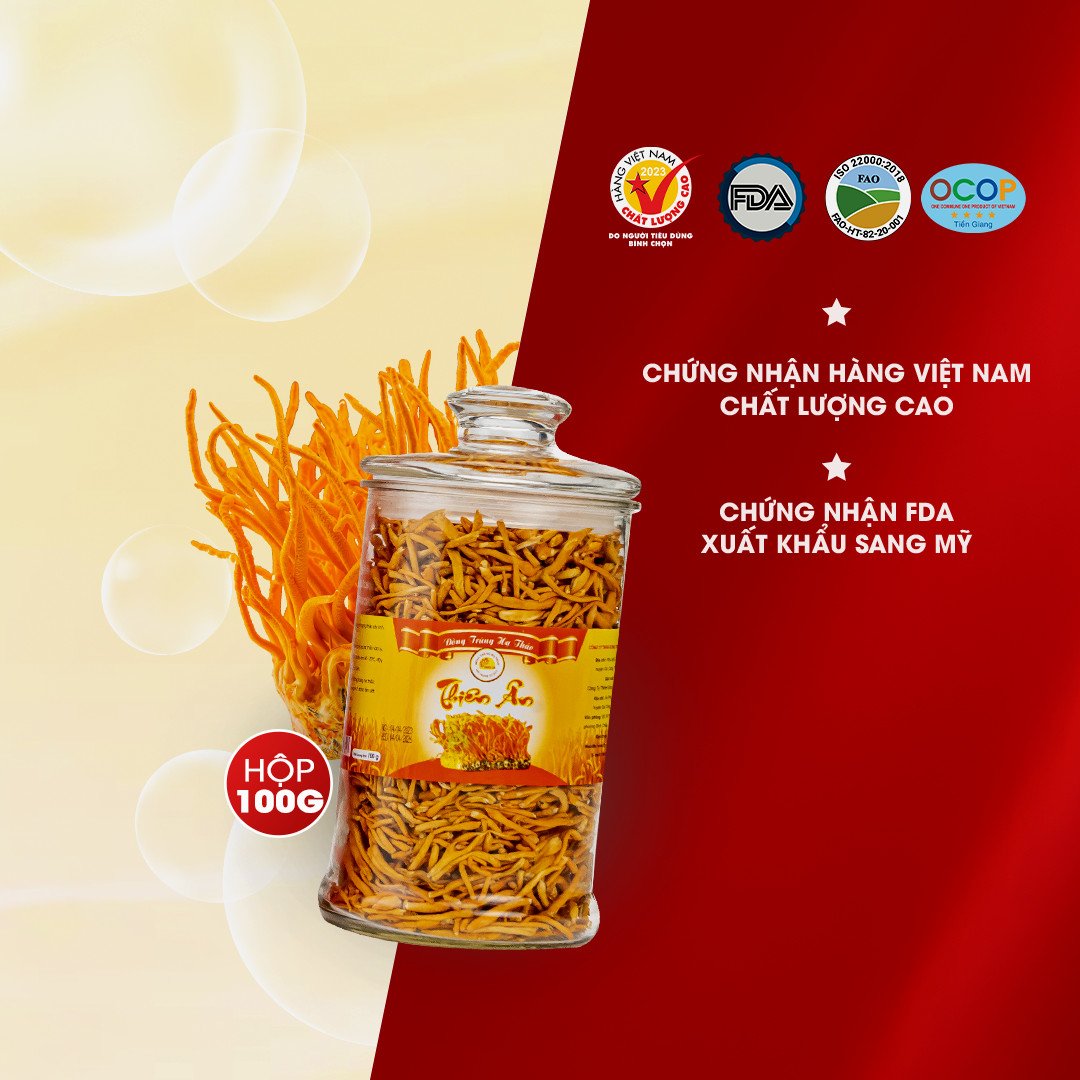 Mua tại TiktokĐông trùng hạ thảo sấy thăng hoa Thiên Ân 100 gram là sản phẩm được sấy thăng hoa từ đông trùng hạ thảo tươi, đảm bảo giữ được 99% hàm lượng dược chất. Quy cách đóng gói: Hũ thủy tinh 100g Sản phẩm được cấp chứng nhận Hàng Việt Nam Chất Lượng Cao do Hội Doanh Nghiệp Hàng Việt Nam Chất Lượng Cao cấp. Sản phẩm đạt tiêu chuẩn FDA xuất khẩu sang Mỹ