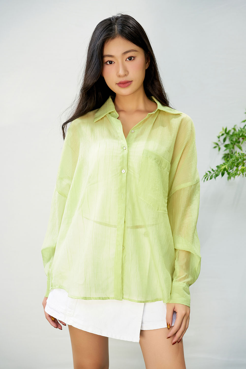 CHẤT SOMI COTTON PHA, MỀM ĐỨNG PHOM ÁO MÀU XANH LÁ ÁO CỔ SOMI, TAY DÀI, NÚT ĐEN PHOM CĂN BẢN SUÔN ĐIỂM NHẤN PHẦN LÁ CỔ, NẸP ÁO, MANGSET BẰNG VẢI HOẠ TIẾT KHÁC
