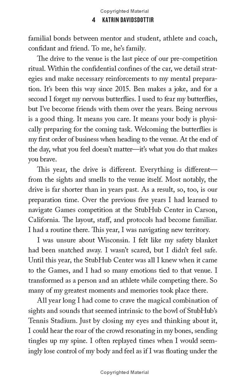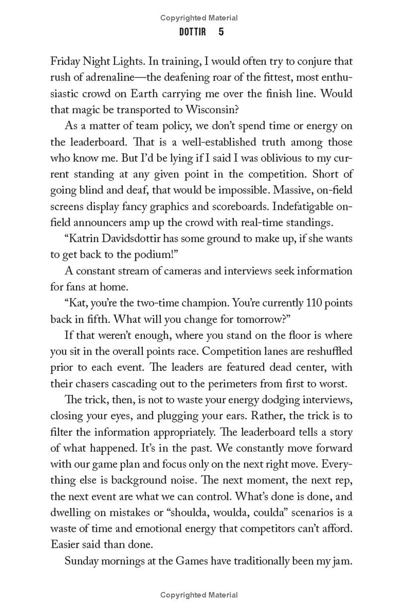 Dottir is two-time consecutive CrossFit Games Champion Katrin Davidsdottir's inspiring and poignant memoir. As one of only two women in history to have won the title of “Fittest Woman on Earth” twice, Davidsdottir knows all about the importance of mental and physical strength. She won the title in 2015, backing it up with a second win in 2016, after starting CrossFit in just 2011. A gymnast as a youth, Davidsdottir wanted to try new challenges and found a love of CrossFit. But it hasn't been a smooth rise to the top. In 2014, just one year before taking home the gold, she didn't qualify for the Games. She used that loss as motivation and fuel for training harder and smarter for the 2015 Games. She pushed herself and refocused her mental game. Her hard work and perseverance paid off with her return to the Games and subsequent victories in 2015 and 2016. In Dottir, Davidsdottir shares her journey with readers. She details her focus on training, goal setting, nutrition, and mental toughness.