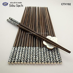 Đũa gỗ tự nhiên siêu sạch xuất Hàn Quốc - Gỗ mun sọc khảm xà cừ. Mô tả sản phẩm: - Mã Số: CTH102 (đũa tròn) - Số lượng: 10 đôi trong hộp đẹp, có