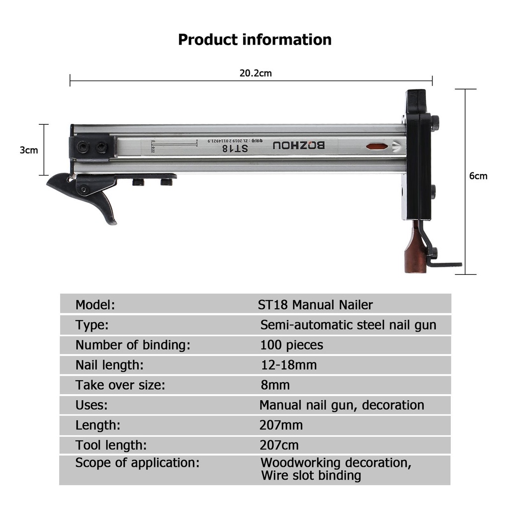 Mua tại TiktokMô hình: Máy đóng đinh bằng tay ST18 Kiểu: máy đóng đinh thép bán tự động Số lượng ràng buộc: 100 miếng Chiều dài móng: 12-18mm Tiếp quản kích thước: 8mm Chiều dài: 207mm Chiều dài dụng cụ: 207cm Mô hình: máy đóng đinh tự động bật lại ST18B Kiểu: máy đóng đinh thép bán tự động Số lượng ràng buộc: 100 miếng Chiều dài móng: 10-30mm Tiếp quản kích thước: 8mm Chiều dài: 207mm Mô hình: ST38 Kiểu: máy đóng đinh thép bán tự động Số lượng ràng buộc: 70 miếng Chiều dài móng: 12-38mm Tiếp quản kích thước: 1mm