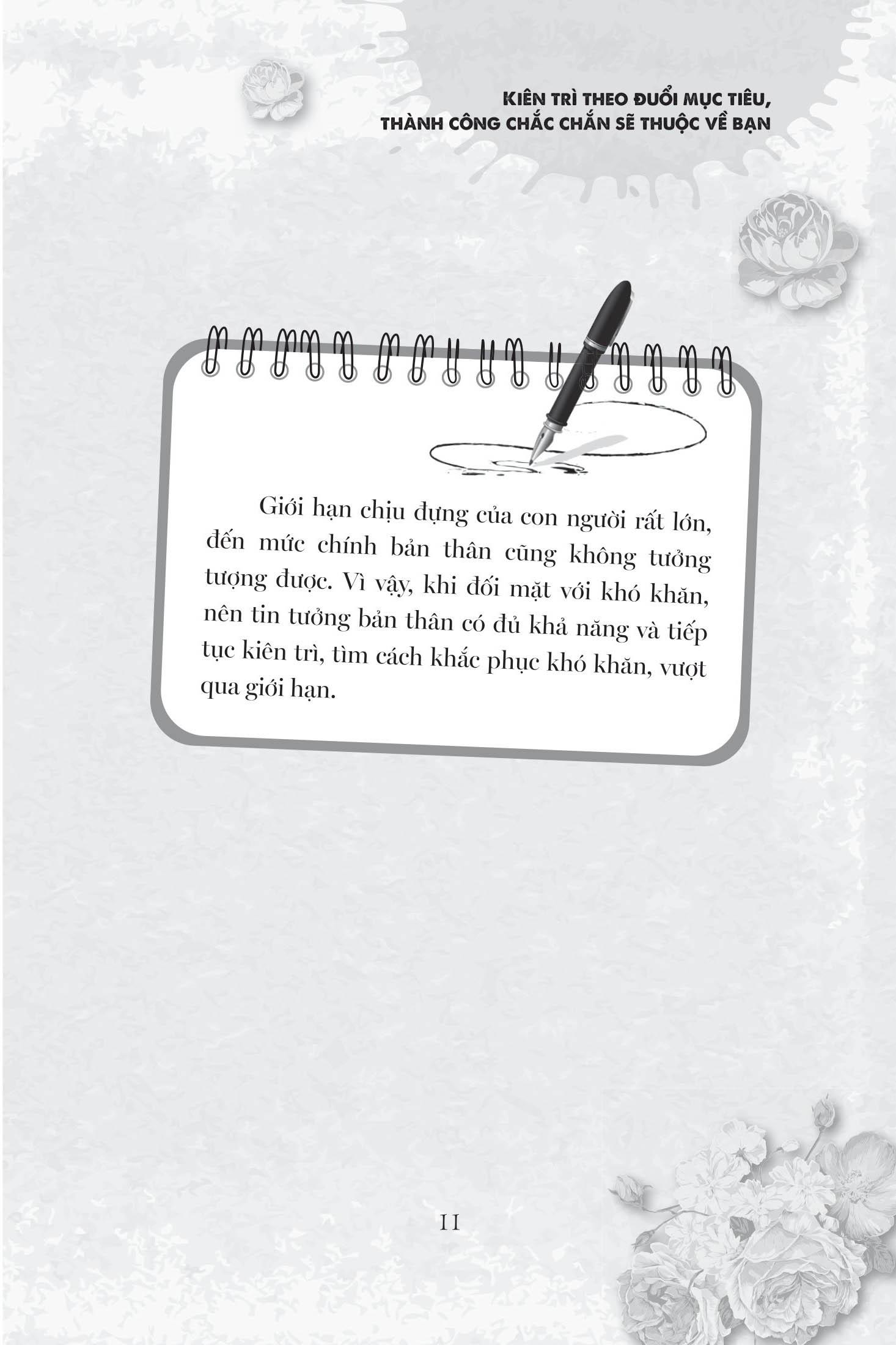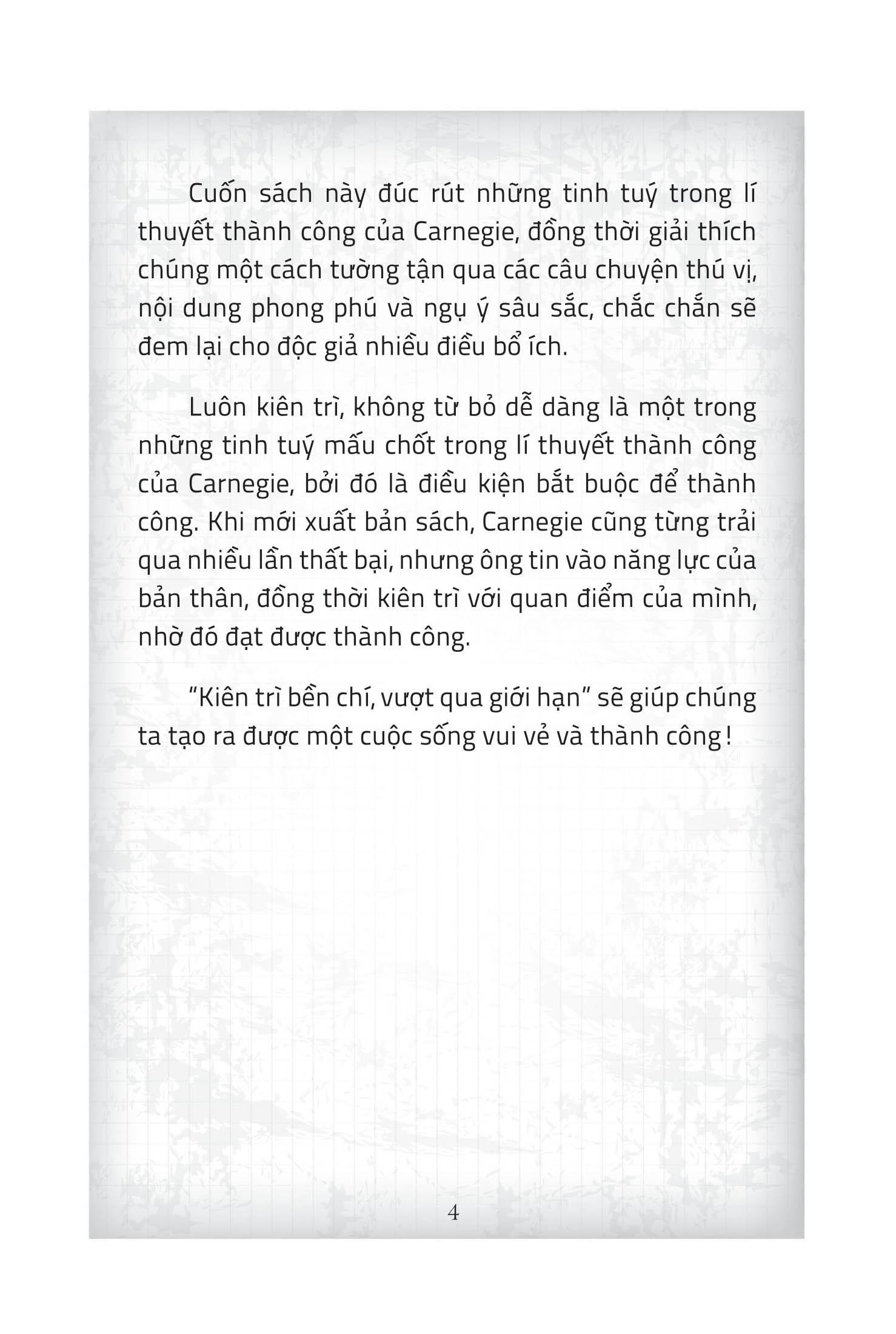 Đứng Dậy Lần Nữa - Cùng Dale Carnegie Tiến Tới Thành Công Nhiều năm về trước, tôi tình cờ đọc được một cuốn sách có tên Những câu cách ngôn về cuộc đời của Carnegie. Những câu nói giản dị nhưng hàm chứa triết lí phong phú trong sách đã thu hút tôi. Carnegie chủ trương xây dựng một thái độ sống tích cực, đề xướng phát huy những ưu điểm trong tính cách, khai phá tiềm năng, bồi dưỡng nhân sinh quan tích cực. Kinh nghiệm thành công của ông đã ảnh hưởng tới toàn thế giới trong suốt hơn nửa thế kỉ qua, vô số người đã học hỏi được những điều hữu ích với bản thân từ đó. Những câu cách ngôn kinh điển này luôn có ích cho sự phát triển của chúng ta. Xã hội hiện nay tuy phát triển với tốc độ nhanh chóng, khoa học kĩ thuật, kinh tế đều không ngừng tiến bộ, nhưng cạnh tranh cũng ngày càng khốc liệt. Trong bối cảnh như vậy, chúng ta cần học hỏi kinh nghiệm của người đi trước để có thể phát triển tốt hơn, nâng cao tố chất tự thân, khiến bản thân thực hiện được những mục tiêu to lớn hơn trong cuộc đời. Cuốn sách này đúc rút những tinh tuý trong lí thuyết thành công của Carnegie, đồng thời giải thích chúng một cách tường tận qua các câu chuyện thú vị, nội dung phong phú và ngụ ý sâu sắc, chắc chắn sẽ đem lại cho độc giả nhiều điều bổ ích. Luôn kiên trì, không từ bỏ dễ dàng là một trong những tinh tuý mấu chốt trong lí thuyết thành công của Carnegie, bởi đó là điều kiện bắt buộc để thành công. Khi mới xuất bản sách, Carnegie cũng từng trải qua nhiều lần thất bại, nhưng ông tin vào năng lực của bản thân, đồng thời kiên trì với quan điểm của m.ình, nhờ đó đạt được thành công. “Kiên trì bền chí, vượt qua giới hạn” sẽ giúp chúng ta tạo ra được một cuộc sống vui vẻ và thành công!