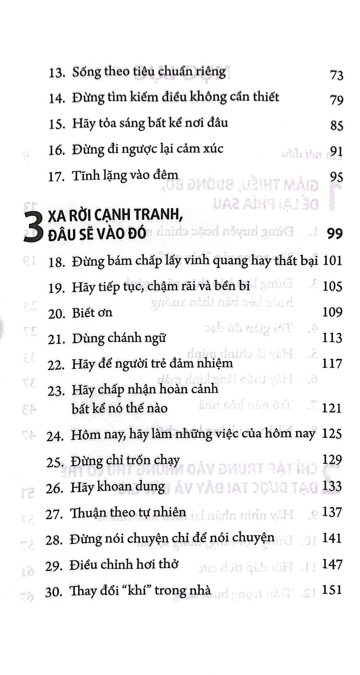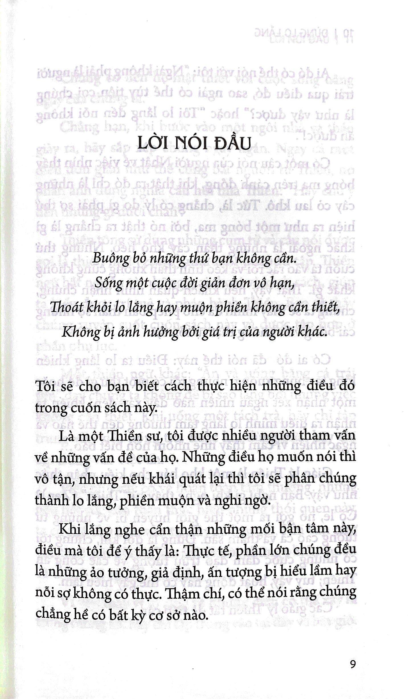 Ta lo lắng về một điều gì đó, nhưng rồi chợt nhận ra nó thật chẳng đáng lo đến vậy. Thật ra, 90% nỗi lo lắng của ta sẽ không thành hiện thực. Ta bỗng thấy nhẹ nhõm biết bao. Bí quyết ở đây là chỉ tập trung vào hiện tại và nơi này, như thế, ta có thể giải phóng m.ình khỏi những lo lắng không cần thiết, để tâm trí ta được bình yên. Thông qua cuốn sách này, SHUNMYO MASUNO sẽ cho ta biết tại sao. Bằng cách làm theo 48 bài học đơn giản và ghi nhớ các câu “thiền ngữ” trong cuốn sách này, ta sẽ cảm thấy bình tĩnh, thoải mái, cuối cùng là tích cực hơn khi tận hưởng cuộc đời này. Thông tin tác giả: Shunmyo Masuno là một vị Thiền sư đáng kính, đồng thời là tác giả của cuốn Nghệ thuật sống đơn giản bán chạy trên toàn thế giới. Thiền sư Shunmyo Masuno là tác giả của nhiều cuốn Thái Hà Books đã xuất bản: Sống đơn giản cho đời thanh thản, Thiền ngữ giản đơn, Cứ an nhiên rồi sẽ bình yên,… Mục lục: 1 GIẢM THIỂU, BUÔNG BỎ, ĐỂ LẠI PHÍA SAU Đừng huyễn hoặc chính m.ình Tập trung vào “bây giờ” Đừng làm bản thân nặng gánh hoặc kéo bản thân xuống Tối giản đồ đạc Hãy là chính m.ình Hãy tháo lăng kính màu Trở nên hòa nhã Nhận ra những hạn chế 2 CHỈ TẬP TRUNG VÀO NHỮNG THỨ CÓ THỂ ĐẠT ĐƯỢC TẠI ĐÂY VÀ BÂY GIỜ Hãy nhìn nhận lại điều hiển nhiên Đừng vội vàng, đừng sợ hãi Hồi đáp tích cực Trân trọng buổi sáng Sống theo tiêu chuẩn riêng Đừng tìm kiếm điều không cần thiết Hãy tỏa sáng bất kể nơi đâu Đừng đi ngược lại cảm xúc Tĩnh lặng vào đêm 3 XA RỜI CẠNH TRANH, ĐÂU SẼ VÀO ĐÓ Đừng bám chấp lấy vinh quang hay thất bại Hãy tiếp tục, chậm rãi và bền bỉ Biết ơn Dùng chánh ngữ Hãy để người trẻ đảm nhiệm Hãy chấp nhận hoàn cảnh bất kể nó thế nào Hôm nay, hãy làm những việc của hôm nay Đừng chỉ trốn chạy Hãy khoan dung Thuận theo tự nhiên Đừng nói chuyện chỉ để nói chuyện Điều chỉnh hơi thở Thay đổi “khí” trong nhà 4 MỘT SỐ MẸO MỚI LẠ GIÚP CẢI THIỆN CÁC MỐI QUAN HỆ Trân trọng những kết nối Xây dựng những mối quan hệ tốt đẹp Nhường người khác Đừng chạy theo “logic” Dành mười phút mỗi ngày giữa thiên nhiên Khiến người muốn gặp lại ta Nhận lỗi ngay Đừng ngại nhờ giúp đỡ Hãy là người biết lắng nghe Đừng quyết định dựa trên được và mất 5 THAY ĐỔI CÁCH LO LẮNG, CUỘC SỐNG SẼ TƯƠI ĐẸP HƠN Tiền bạc Già đi Tuổi già Tình yêu Hôn nhân Con cái Cái chết Hồi kết của một người Trích đoạn nội dung: NHẬN LỖI NGAY Hãy truyền tải lời xin lỗi cùng cảm xúc chứ không chỉ bằng lời nói Bạn đã từng xích mích với bạn bè của m.ình chưa? Một tình bạn lâu dài nhất định có bất hòa hoặc hiểu lầm. Những điều này có thể dẫn đến rạn nứt. Tôi rất ngạc nhiên nếu giữa những người bạn thân thiết không có một cuộc chiến nào. Quan trọng làcách xử lý và hòa giải. Nếu bất cẩn, ta có thể phá vỡmối quan hệ bản thân đã vất vả tạo dựng. Để một hiểu lầm hoặc lời xin lỗi vụng về phá vỡ một mối quan hệ thật sự thật đáng tiếc. Không quá lời khi nói cuộc sống sẽ kém sôi động hơn khi thiếu vắng mối quan hệ đó. “Quá tắc vật đạn cải (có lỗi thì chớ ngại sửa đổi).” Đây là một câu nói nổi tiếng trong sách Luận Ngữ của Khổng Tử, nhưng áp dụng nó vào thực tế có thể rất khó khăn. Ngay cả khi nhận ra chính điều bản thân đã làm gây ra vấn đề, vì lý do nào đó, ta vẫn ngại xin lỗi. Thể hiện sự hối hận với một người bạn tốt có thật sự khó không? Về điều này, Luận Ngữ nói: “Quá nhi bất cải, thị vị quá hĩ (có lỗi mà không sửa, đấy mới thật là có lỗi).” Làm sai và không xin lỗi chính là một cái sai. Trong khi ta vật lộn với câu hỏi liệu có cần xin lỗi hoặc xin lỗi như thế nào, tình hình đang càng trở nên phức tạp và ta có nguy cơ không thể sửa chữa mối quan hệ này nữa. Lời xin lỗi luôn phải ngay lập tức và trực tiếp. Việc gì càng để lâu càng khó giải quyết. Việc xin lỗi cũng không khác gì. Ngay cả khi nói xin lỗi ngay lập tức nhưng không có bất kỳ cố gắng hòa giải nào, thời gian càng trôi đi thì càng khó hòa giải hơn. Không khó hình dung người kia cảm thấy thế nào. “Anh ta xin lỗi ngay lập tức. Có vẻ như anh ta không có ý đó” sẽ trở thành “Anh ta làm sao vậy? Liệu anh ta có nhận ra bản thân đã làm tổn thương không?” sau đó là “Mình chưa từng nghĩ anh ta là loại người đó” và cuối cùng “Đúng là tên khốn! Không thể tin m.ình đã làm bạn với hắn lâu thế này!”. Quan trọng là lời xin lỗi phải được thực hiện trực tiếp. Trong Thiền có từ menju, nghĩa là “mặt đối mặt”. Nó chỉ cuộc gặp mặt trực tiếp giữa sư phụ và đệ tử, vì những giáo lý quan trọng của nhà Phật được truyền thụ không phải bằng kinh sách hay văn tự mà là trực tiếp, khi những người liên quan đều có mặt. Việc này áp dụng được hoàn hảo