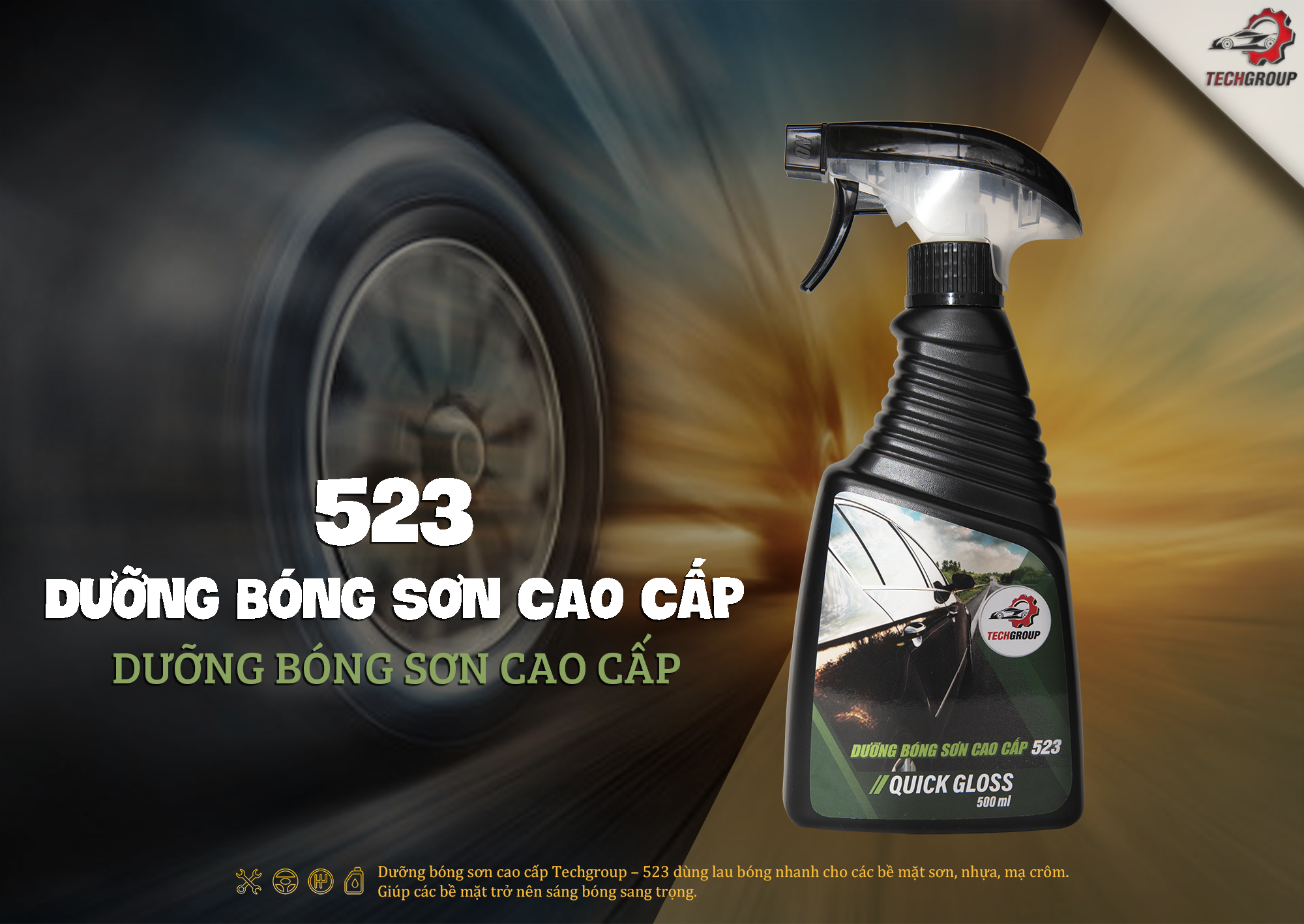 Dưỡng bóng sơn cao cấp Techgroup – 523 dùng lau bóng nhanh cho các bề mặt sơn, nhựa, mạ crôm. Giúp các bề mặt trở nên sáng bóng sang trọng. 1.  Tính Năng : – Dễ