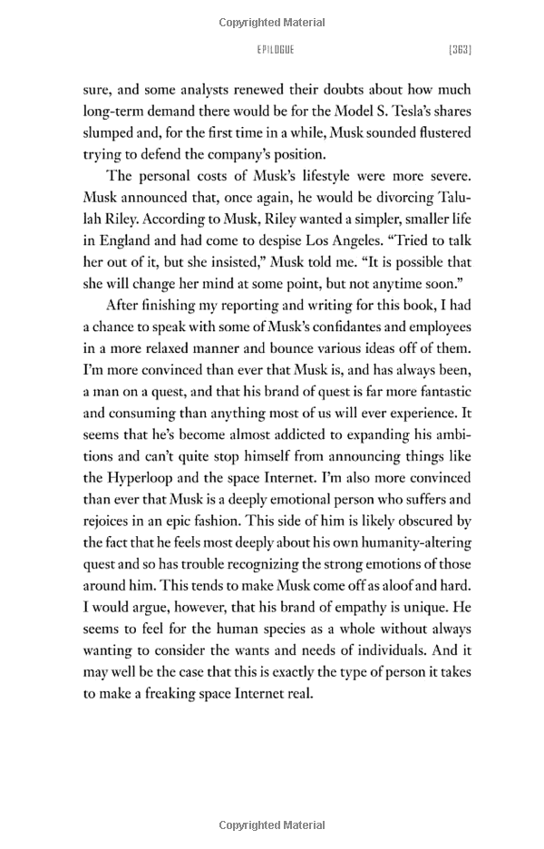 In Elon Musk: Tesla, SpaceX, and the Quest for a Fantastic Future, veteran technology journalist Ashlee Vance provides the first inside look into the extraordinary life and times of Silicon Valley's most audacious entrepreneur. Written with exclusive access to Musk, his family and friends, the book traces the entrepreneur's journey from a rough upbringing in South Africa to the pinnacle of the global business world. Vance spent more than 30 hours in conversation with Musk and interviewed close to 300 people to tell the tumultuous stories of Musk's world-changing companies: PayPal, Tesla Motors, SpaceX and SolarCity, and to characterize a man who has renewed American industry and sparked new levels of innovation while making plenty of enemies along the way. Vance uses Musk's story to explore one of the pressing questions of our time: can the nation of inventors and creators which led the modern world for a century still compete in an age of fierce global competition? He argues that Musk--one of the most unusual and striking figures in American business history--is a contemporary amalgam of legendary inventors and industrialists like Thomas Edison, Henry Ford, Howard Hughes, and Steve Jobs. More than any other entrepreneur today, Musk has dedicated his energies and his own vast fortune to inventing a future that is as rich and far-reaching as the visionaries of the golden age of science-fiction fantasy.